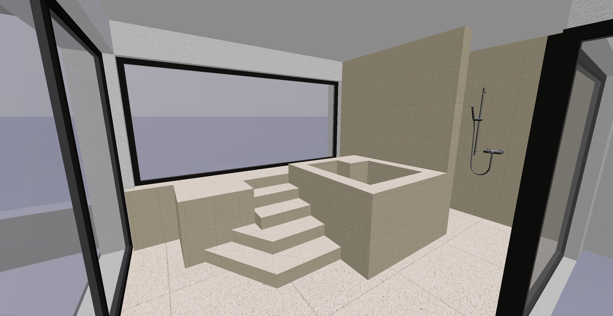 genau dieses rendering berarbeiten fotorealistisches innenraum foto exakt dieselbe perspektive und kameraposition wie das hochgeladene referenzbild 100 identische raumgeometrie vogelperspektive im aussenbereich kleinst dtische gewerbeumgebung durch die fenster drei etagen tiefer sichtbar ganz auf der linken seite ist aussen die gedeckte terrasse rechts hinten ist die dusche auf der linken seite eine treppe mit indirekter beleuchtung der untersten zwei tritte vollfl chige horizontale jalousien ausserhalb der fenster beim fenster in front sind die jalousien komplett unten alle beigen w nde und der beige boden ist homogener hellbeiger kalkstein visso montenegro platten 80x40 cm alle anderen w nde und die decke sind weissputz ral 9016 das fenster in front hat auf beiden seiten einen transparenten raumhohen beigen vorhang beim fenster auf der linken seite ebenfalls ein raumhoher vorhang rechts hinter der badewanne tauchbecken ein modernes bild an der wand am boden steht vorne im bild auf der linken seite eine grosse moderne topfpflanze auf der linken seite hat es auf dem podest b cher und accessoires eine sehr h bsche asiatische frau um 25 sitzt im mit wasser gef llten tauchbecken raum zus tzlich k nstlich ausleuchten mit schwarzen runden deckenspots sanfte realistische schatten weiches nat rliches tageslicht mit schatten der jalousien an den w nden dusche hinten auf der rechten seite hell ausleuchten ganz rechts im bild ist die sauna sichtbar realistische materialien hochwertige oberfl chenreflexionen nat rliche farbwiedergabe golden hour feeling hell ausleuchten das bild muss wie eine professionelle fotografie aussehen es soll ein echtes und reales foto sein canon eos r5 35 mm festbrennweite f 2 8 hyperrealistisch dslr qualit t raw aufnahme 8k aufl sung extrem scharf perfekte tiefensch rfe professionelle architekturfotografie aus der vogelperspektive