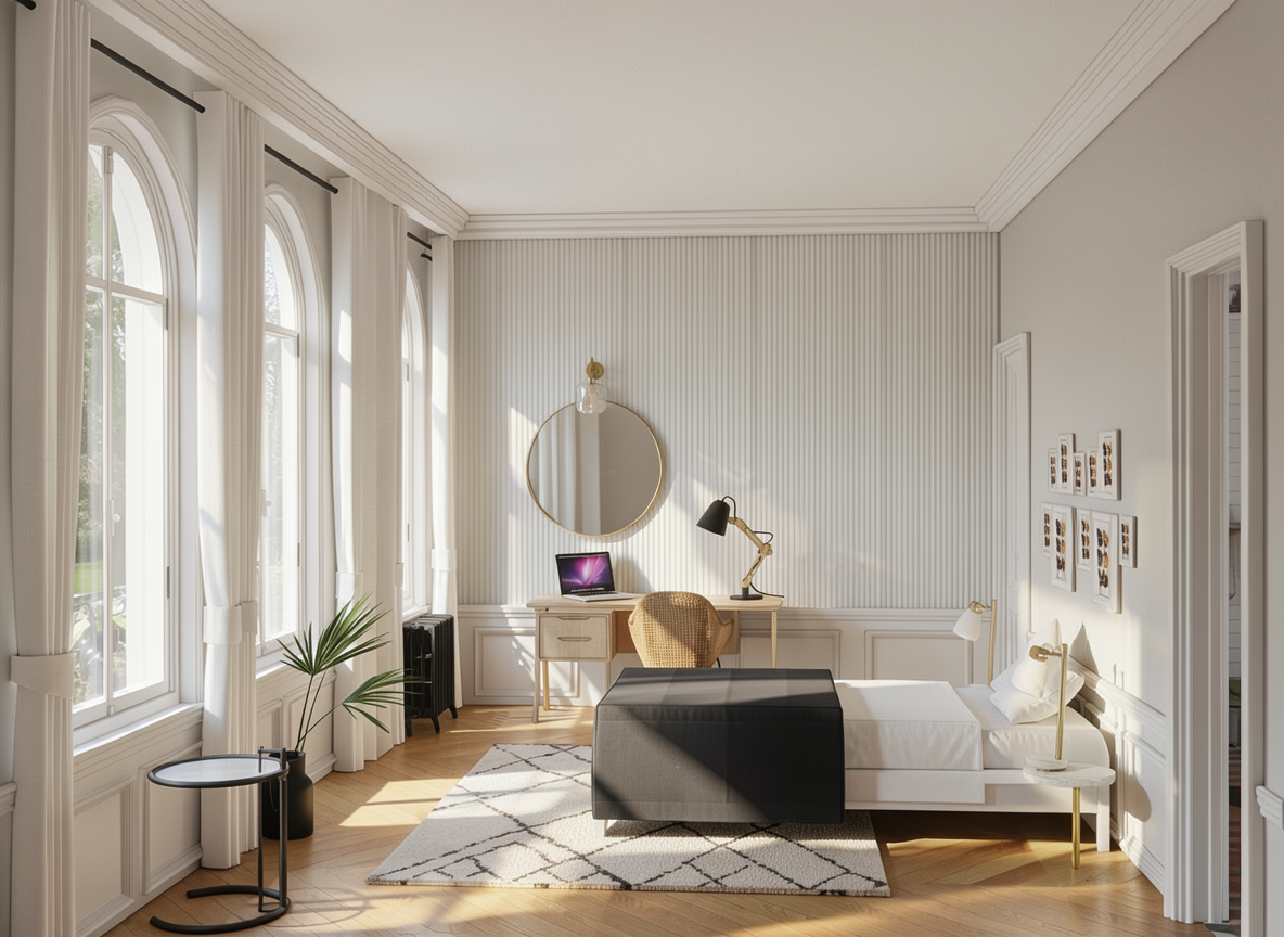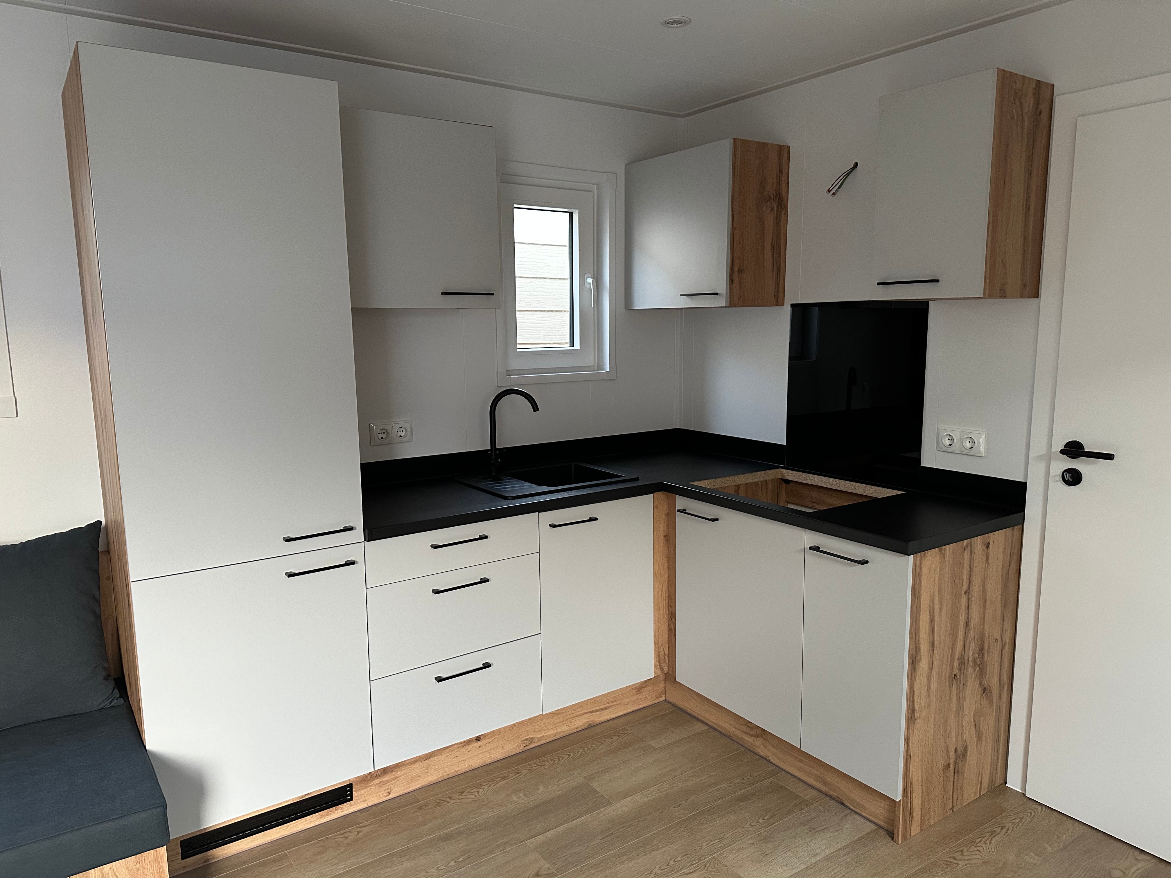 please create a natural photorealistic visualisation based solely on the provided photograph of the kitchen please preserve 100 of the original appearance of the kitchen without any changes to the layout proportions perspective or framing do not change the colours materials or finishes of the kitchen furniture worktop walls floor or ceiling do not modify any cabinets fronts handles appliances or details the only permitted changes are add an induction hob that fits perfectly into the existing cut out in the worktop without changing the size of the opening or the worktop add an under cabinet extractor hood above the hob completely hidden in the lower part of the wall cabinet invisible from the outside do not add or remove any other elements realistic lighting natural shadows actual scale photorealism natural textures no stylisation no render effect