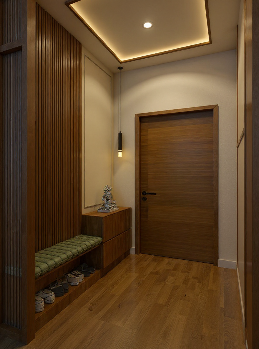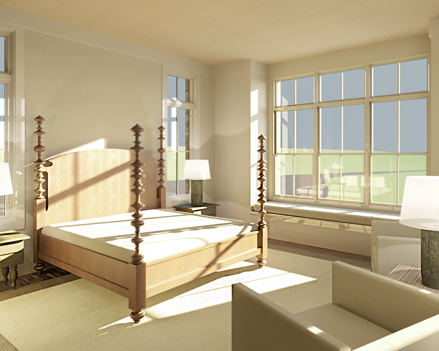 clean modern french country aesthetic grasscloth ceiling classical chunky crown molding around ceiling plush and cozy window seat mahogany four poster bed with overstuffed duvet excessively large sisal rug exterior is dense northwoods wisconsin