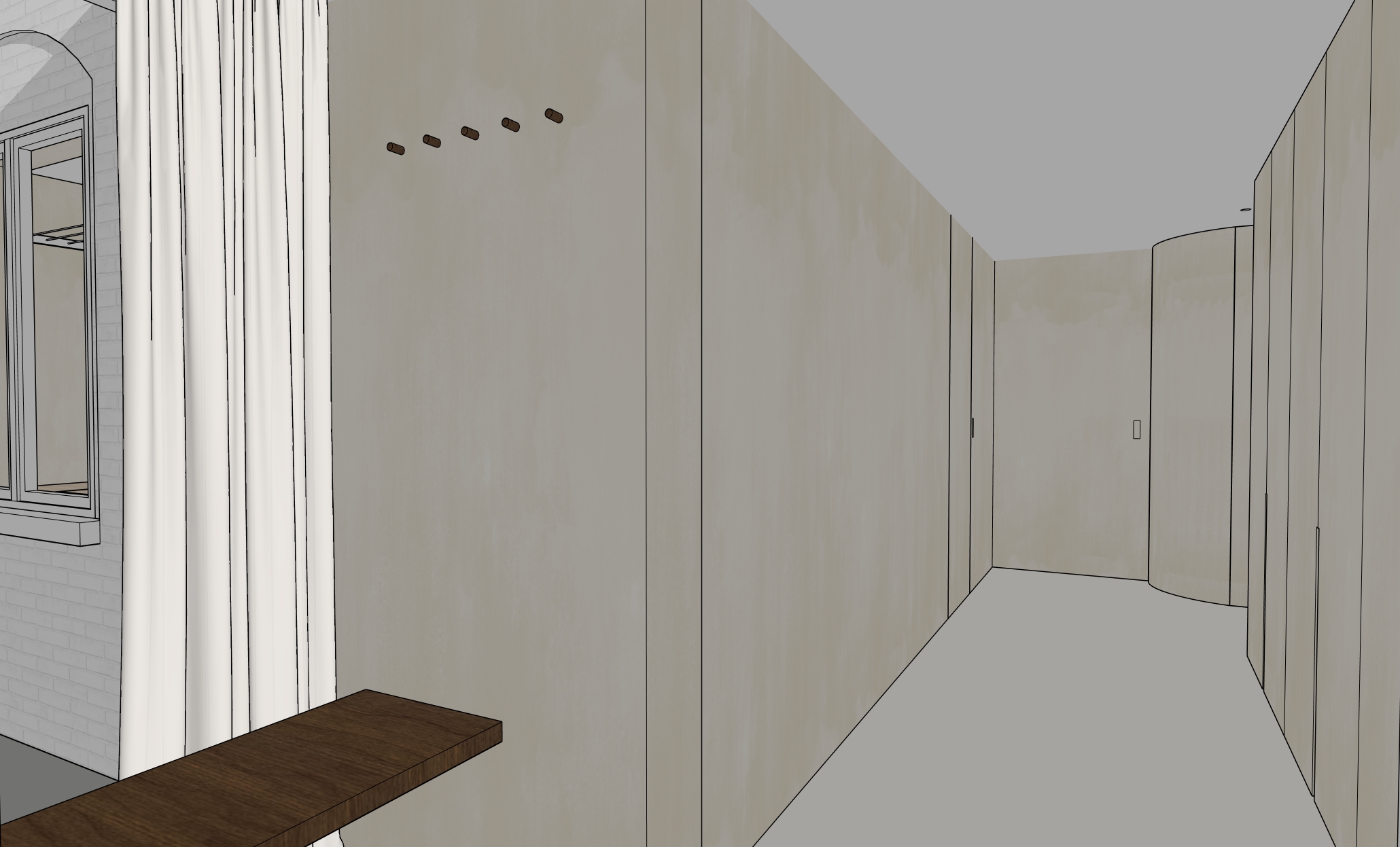 highly realistic interior rendering of an entrance hall with a built in seating bench the window frame is white allowing natural daylight to enter the space the walls are finished in a light limewash with a soft subtle texture the floor is covered with large format lightgray tiles with clean joints preserve the original proportions materials and spatial composition calm minimal atmosphere natural light high realism