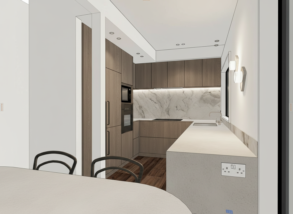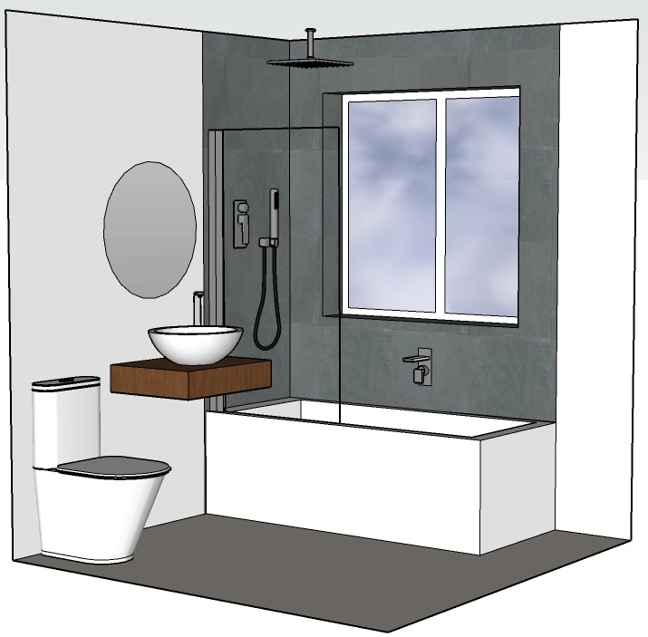 create a beautifully rendered minimalist bathroom with a serene atmosphere use sleek modern design elements the walls are a subtle white the area around the shower and bath are a deep grey tile the floor is a matte beige tile the bathtub and toilet are pristine white with sleek contemporary lines the shower fixtures are polished chrome the floating vanity is made of rich dark wood providing a warm contrast the vessel sink is a clean glossy white the window shows a serene blue sky with fluffy white clouds letting in natural light the overall atmosphere is tranquil and modern with a balanced composition of cool and warm tones