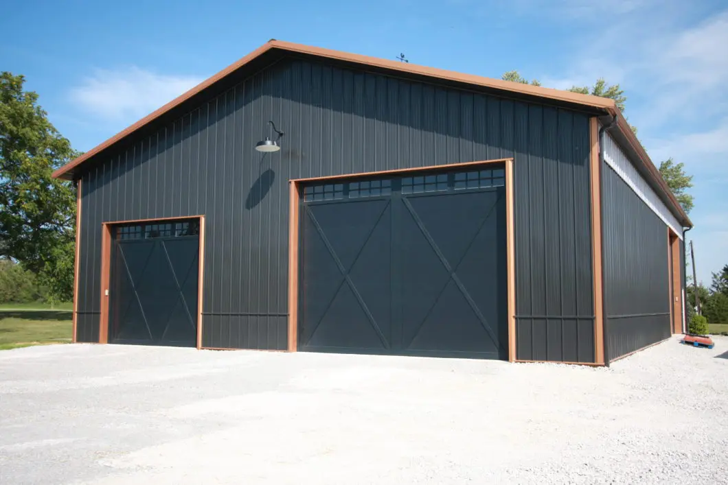 hyper realistic minimalist brown walls and copper roof with beige doors metal house steel iron frame construction with gable roof style large garage door on the front countryside scenery surrounded by dirt and trees beautiful blue clear sky full view architecture