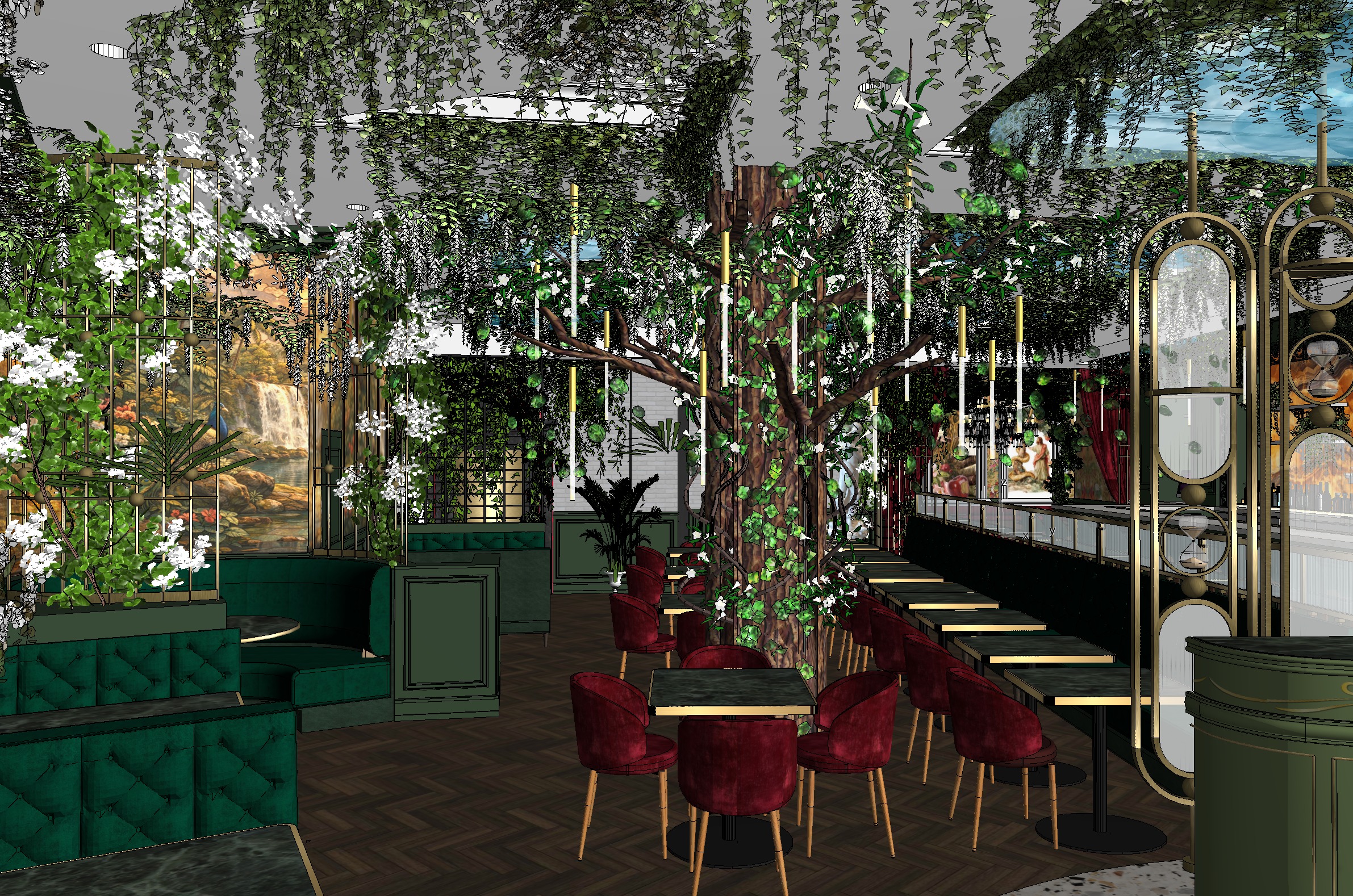 tree cinematic light engine the central tree installation must act as the living sculptural centerpiece of the restaurant interior the tree trunk must appear thick organic and highly detailed with natural bark texture and subtle irregularities branches spread outward horizontally creating a natural canopy above the dining area climbing ivy vines wrap around the trunk and branches creating layered botanical depth integrated along the vines and branches are thin concealed led light strips the led lights follow the natural direction of the vines and branches appearing embedded within the foliage rather than attached artificially the led lighting emits a soft warm glow approximately 2700k 3000k the lights create gentle highlights along tree bark texture ivy leaves hanging wisteria clusters the light must appear diffused and natural softly illuminating the surrounding foliage some leaves closest to the led strips show subtle translucency as light passes through them the led lighting must feel atmospheric rather than bright creating glowing lines of light that trace the organic structure of the tree this illumination creates cinematic depth inside the botanical canopy the crown of the tree contains layered botanical density consisting of cascading ivy vines and hanging white wisteria flowers the lighting should create natural shadow patterns across the ceiling walls and surrounding seating areas the result must feel immersive and magical as if the tree itself softly illuminates the restaurant space the tree must appear alive sculptural and monumental while remaining completely realistic