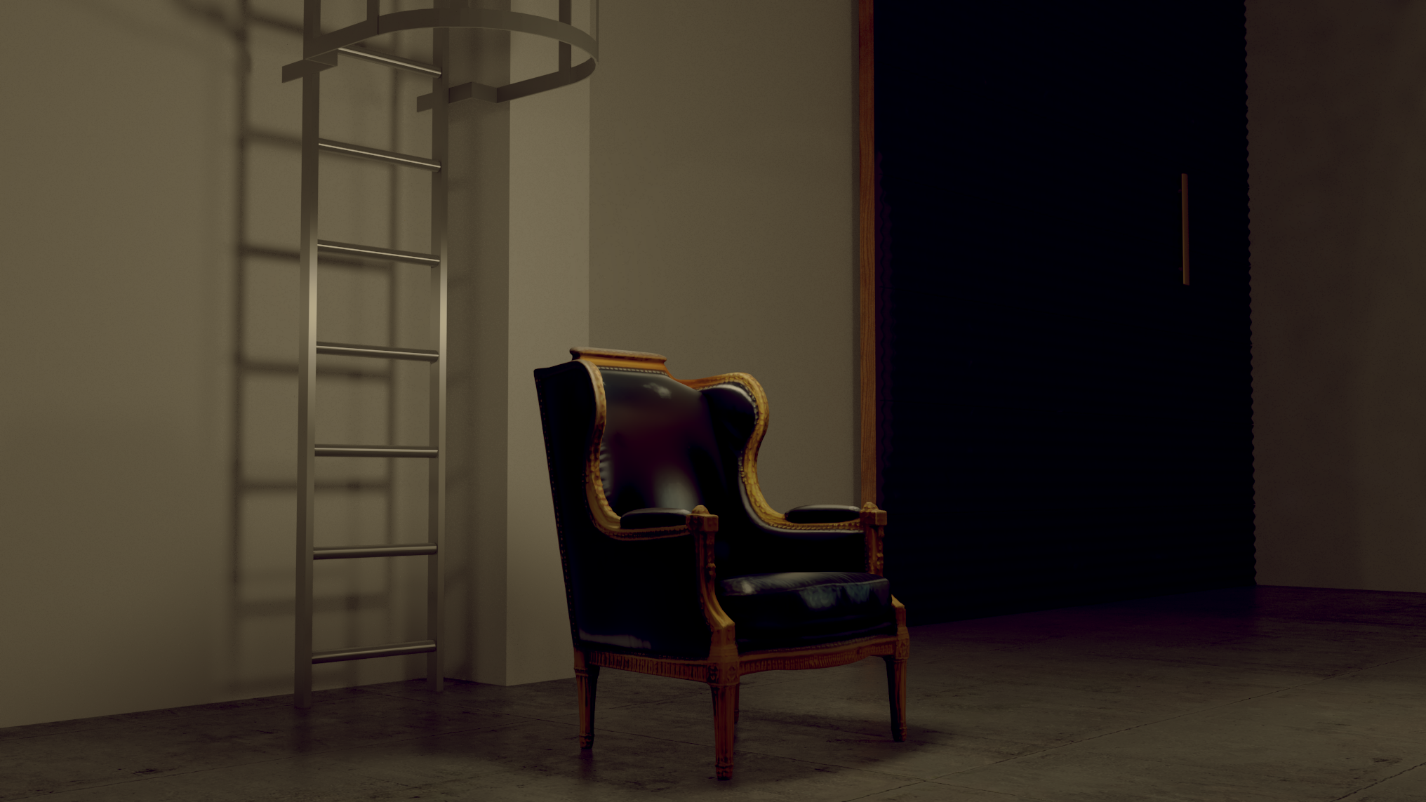 the wall is gray with a slightly old texture the floor is concrete and the staircase is dark metal overall the atmosphere is dim with cinematic night lighting and warm toned fog haze