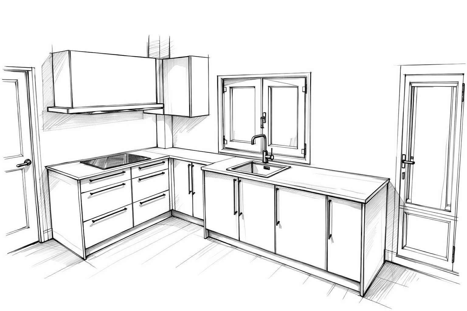cocina con puertas como la imagen de referncia suelo madera roble natural paredes azulejos cl sicos peque os en negro brillo encimera grantio negro mate exterior amanecer con iluminaci n agradable