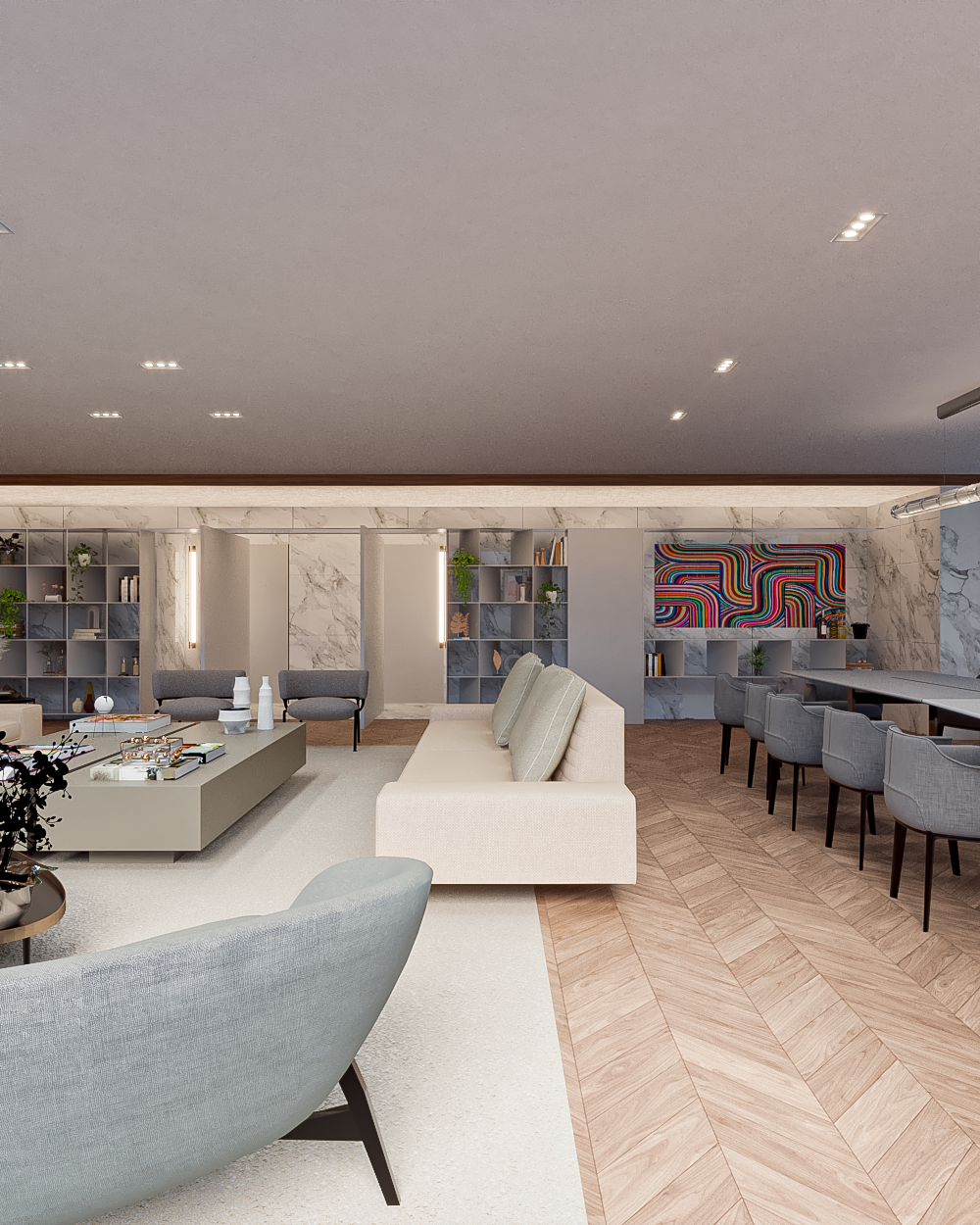enhance realism of this interior render without changing the architecture furniture materials layout colors or artwork keep the same camera angle and composition improve natural daylight to create a warm sunny daytime atmosphere with soft natural shadows increase material detail realistic fabric texture on the chairs natural wood grain on the herringbone floor subtle reflections and veining on the marble and soft ambient occlusion in corners maintain an elegant contemporary aesthetic add a man and a woman sitting together on the sofa in a relaxed posture facing slightly toward each other as if having a quiet conversation ensure their faces are turned away or subtly obscured so facial features are not visible their clothing should be neutral and casual integrated naturally into the lighting and color palette add a small dog sitting or lying calmly on the floor near the sofa or dining table proportionally scaled and realistically lit all additions must appear naturally integrated in perspective lighting and texture do not draw excessive attention to the figures they should feel like part of the scene