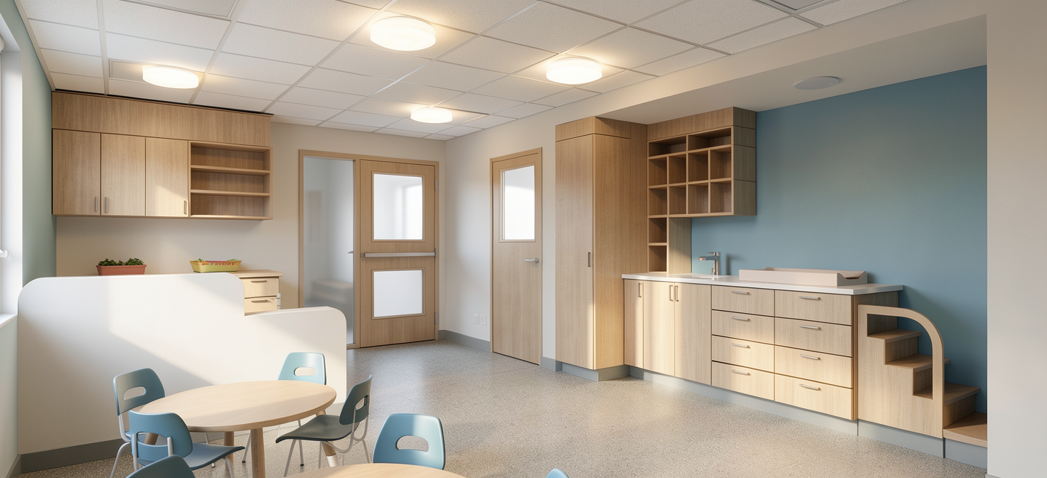 architectural interior render of a childcare center based strictly on the provided sketchup image do not add remove or modify any architectural elements furniture openings or layout keep all objects proportions and positions exactly as modeled all existing ceiling light fixtures must be turned on and emit soft realistic illumination combine artificial lighting with natural light if present keeping a balanced and believable exposure preserve the original colors and materials but enhance them with realistic textures accurate material properties and subtle imperfections fabric softness matte finishes child friendly clean calm and warm atmosphere suitable for a child care center environment realistic global illumination soft shadows correct scale neutral camera perspective no dramatic effects no stylization semi realistic architectural visualization professional quality natural color grading no new furniture no extra decor no change in layout no change in wall positions no change in ceiling design no exaggerated lighting no cinematic effects moderate cartoon look keep the original wall and ceiling colors