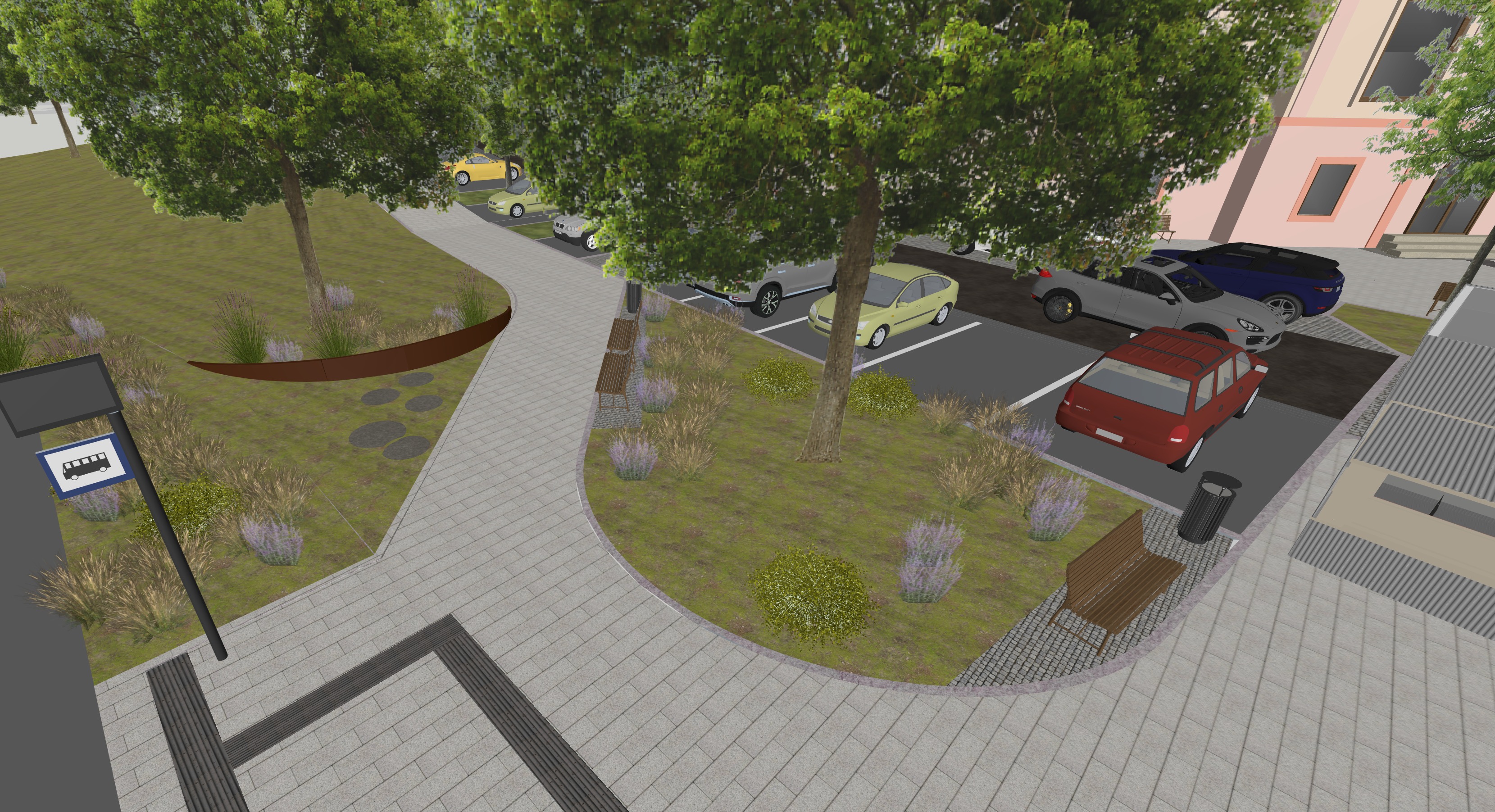 ultra realistic architectural visualization based strictly on the provided raw sketchup view preserve exact geometry proportions camera angle composition and architectural details do not redesign or alter the building enhance only with realism add realistic materials with physically accurate textures natural wood grain brushed concrete glass reflections subtle imperfections micro surface details use high dynamic range lighting with soft global illumination and realistic shadows create a lively atmosphere enhance environment with greenery slight wind in trees varied vegetation tones small urban details parked cars benches subtle signage add depth with atmospheric perspective and realistic sky conditions golden hour soft overcast choose whichever enhances the mood cinematic composition photorealistic rendering 8k detail realistic depth of field natural color grading slightly warm tones architectural photography style shot on full frame camera 35mm lens maintain realism over stylization avoid cartoonish or ai looking artifacts the round brown texture under the tree trunk is smooth round piece of corten