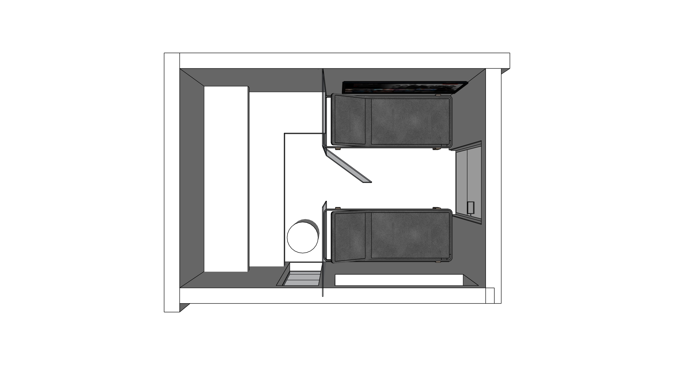 use the attached perspective whitebox image as the exact geometry reference keep the spatial depth wall positions glass partition sauna position door position benches heater tv and windows exactly as shown do not redesign the layout create a photorealistic interior architectural render of this indoor wellness sauna space materials front outer interior walls vertical spruce cladding 140 mm wide boards sauna interior walls and ceiling brushed thermo alder horizontal boards 120 mm wide benches same brushed thermo alder glass partition between sauna and front space dark grey tinted architectural glass heater harvia cilindro floor refined premium indoor floor finish style high end indoor wellness interior modern minimal architectural warm calm premium atmosphere photorealistic clean detailing important this is an interior space preserve the exact perspective geometry from the reference do not change the layout do not add decor plants towels bottles or extra objects do not reinterpret the space do not create a symmetrical frontal composition