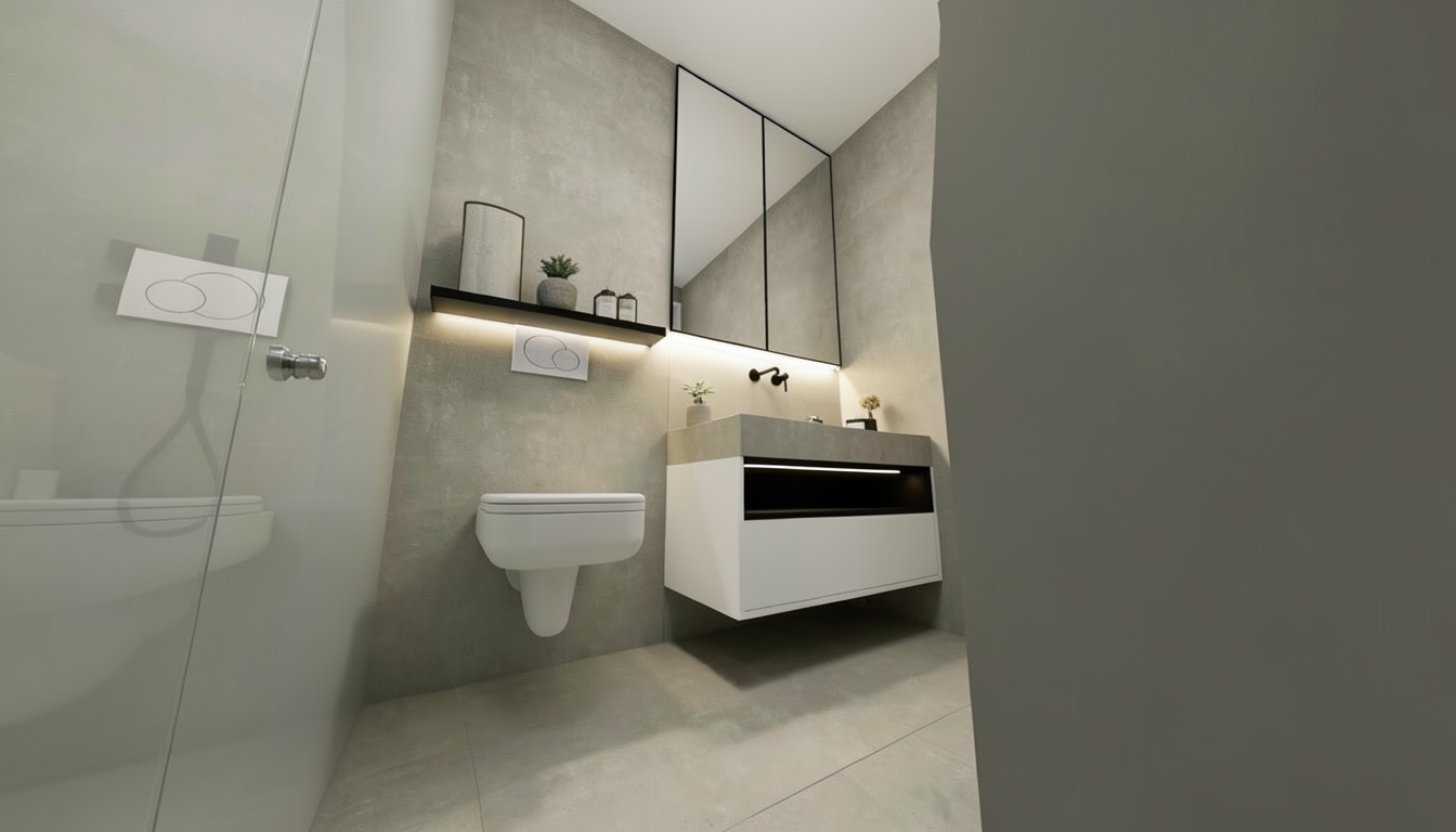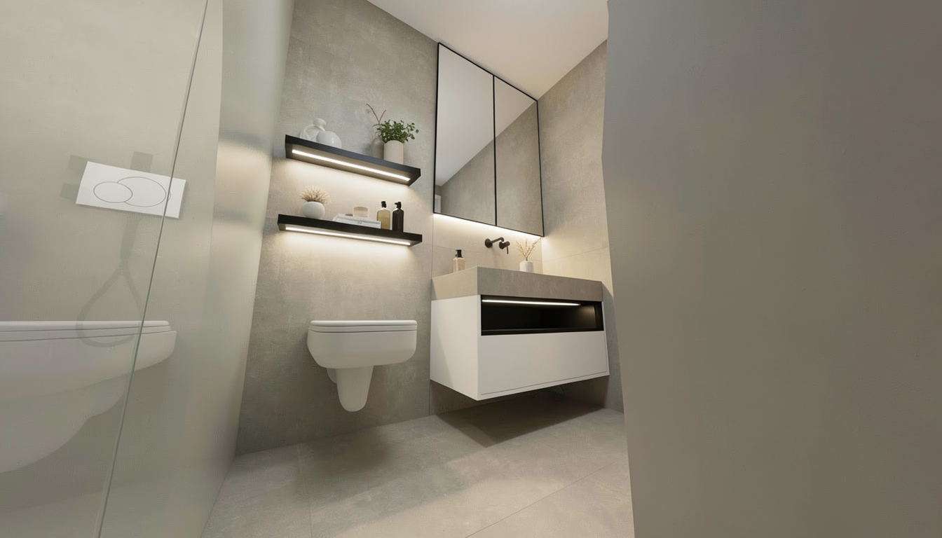 minimalist bathroom add led lights in the black shelve too and minimal decorations keep original nodes no light under the mirror