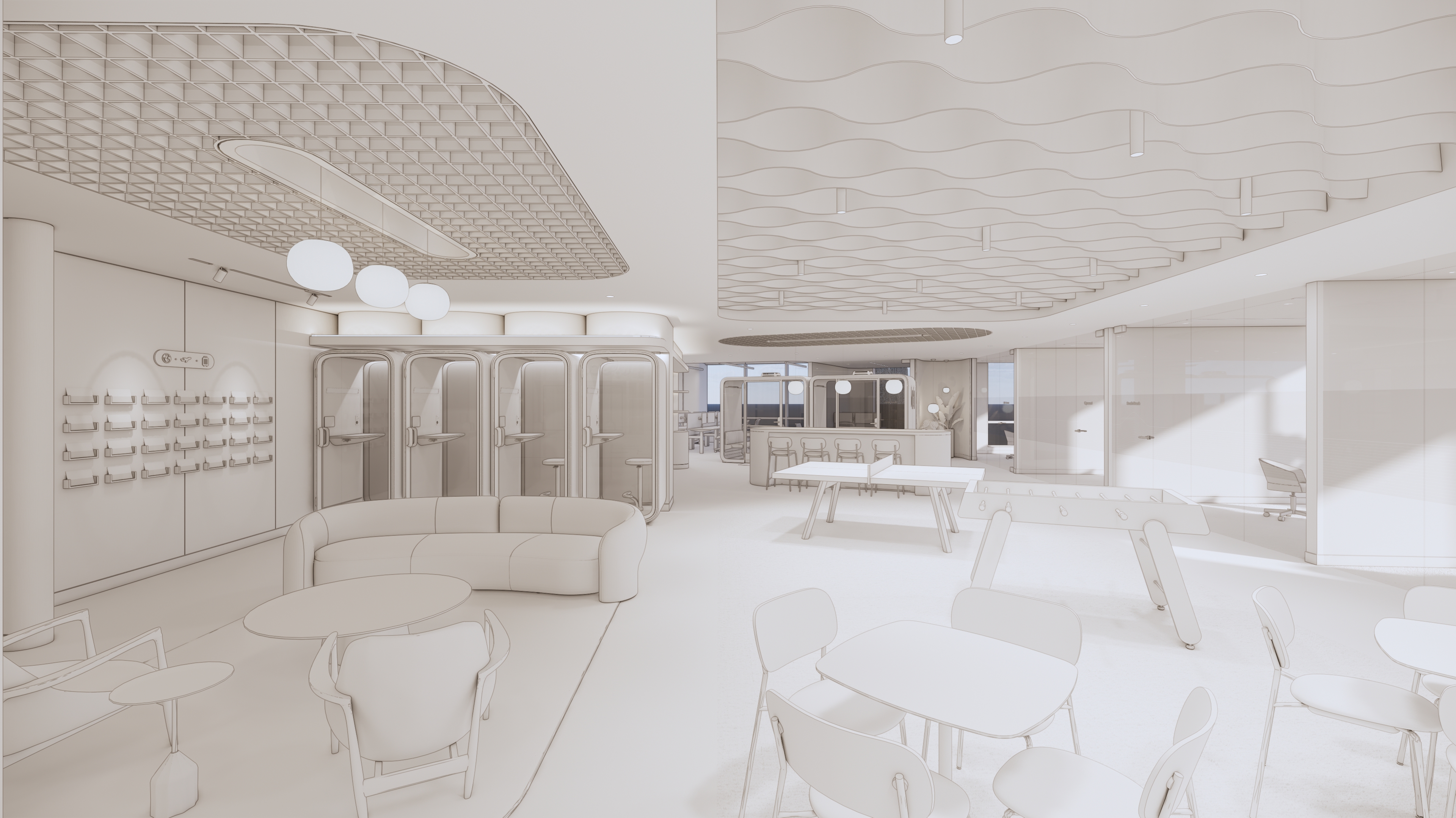 help me render this interior office space for skyscanner the concept is a bright timeless elegant trpoical and fresh palette that resembles the skyscanner brand blending miami vibes and sunshine a space that is brand oriented tropical vinbrant and coastal architecture