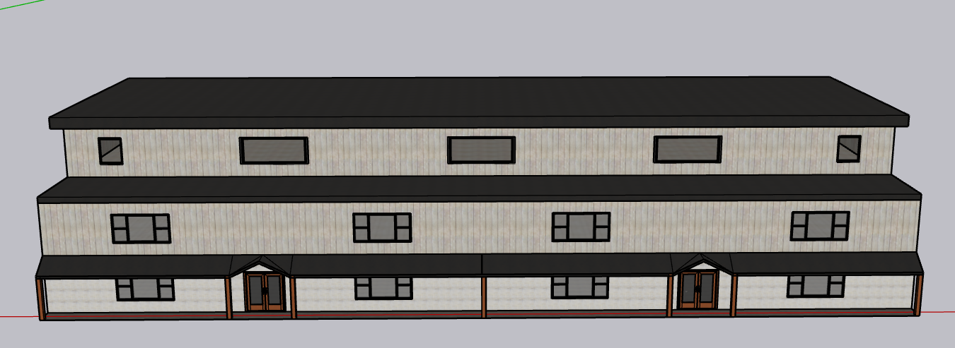 three story commercial building in a small village main street semi realistic marketing architectural rendering clean and bright style contemporary design with rustic farmhouse touches ground floor in textured brick warm red brown large modern storefront windows and glass doors upper floors with vertical board and batten siding in soft off white black metal roof standing seam matte finish wooden accents on entrances columns and small awnings symmetrical long building with a consistent and unchanged number of windows full building visible front facing view of the building the street is only in front of the building not visible on the sides clear and unobstructed view of the entire facade clean sidewalk and street in front strictly no parked cars no vehicles blocking the facade open and clean foreground subtle small village context in the background lightly suggested not distracting trees in the background soft warm afternoon sunlight bright inviting atmosphere light shadows high quality real estate rendering slightly idealized clean composition