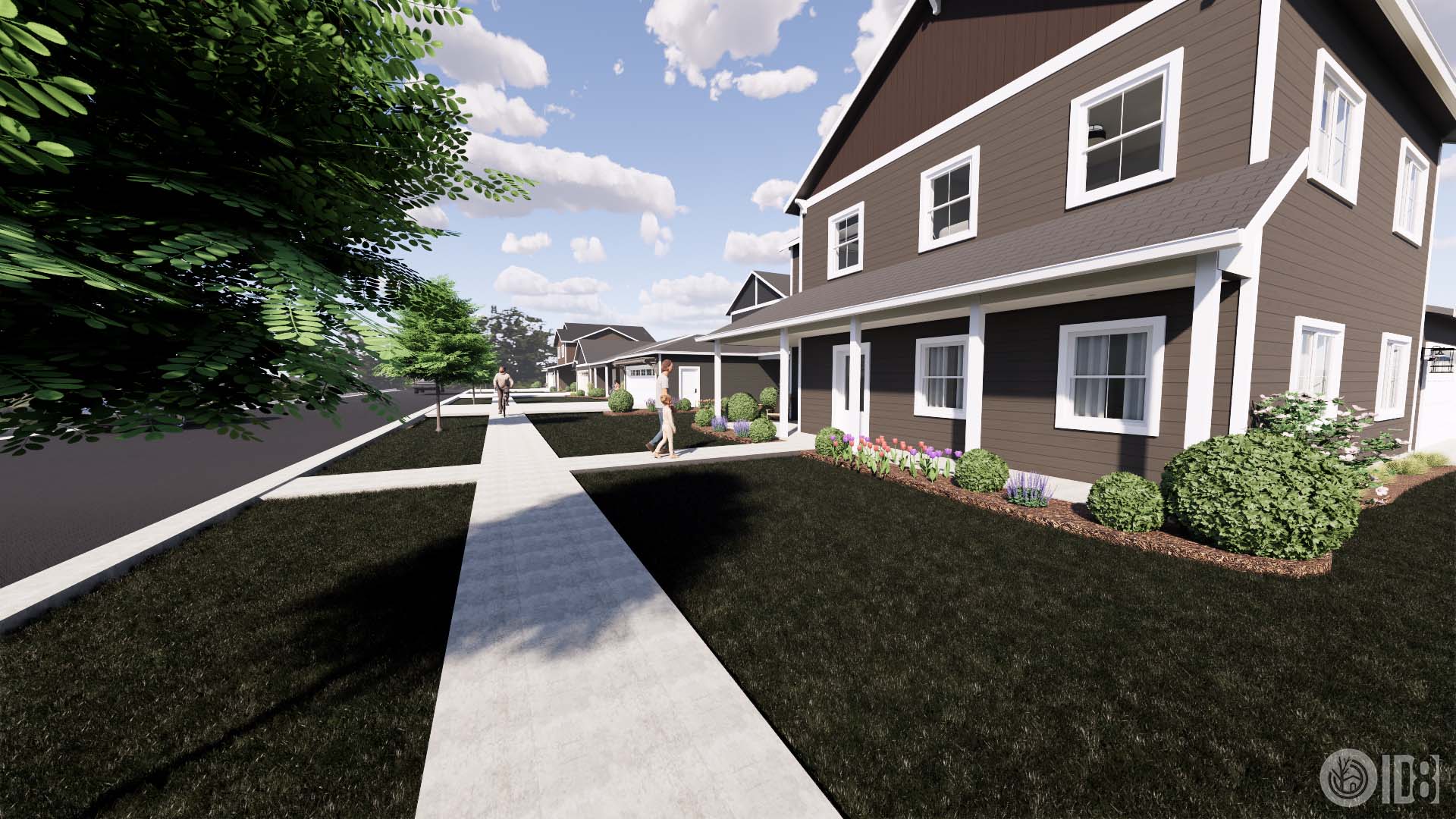 make this neighborhood rendering more realistic and include realistic trees