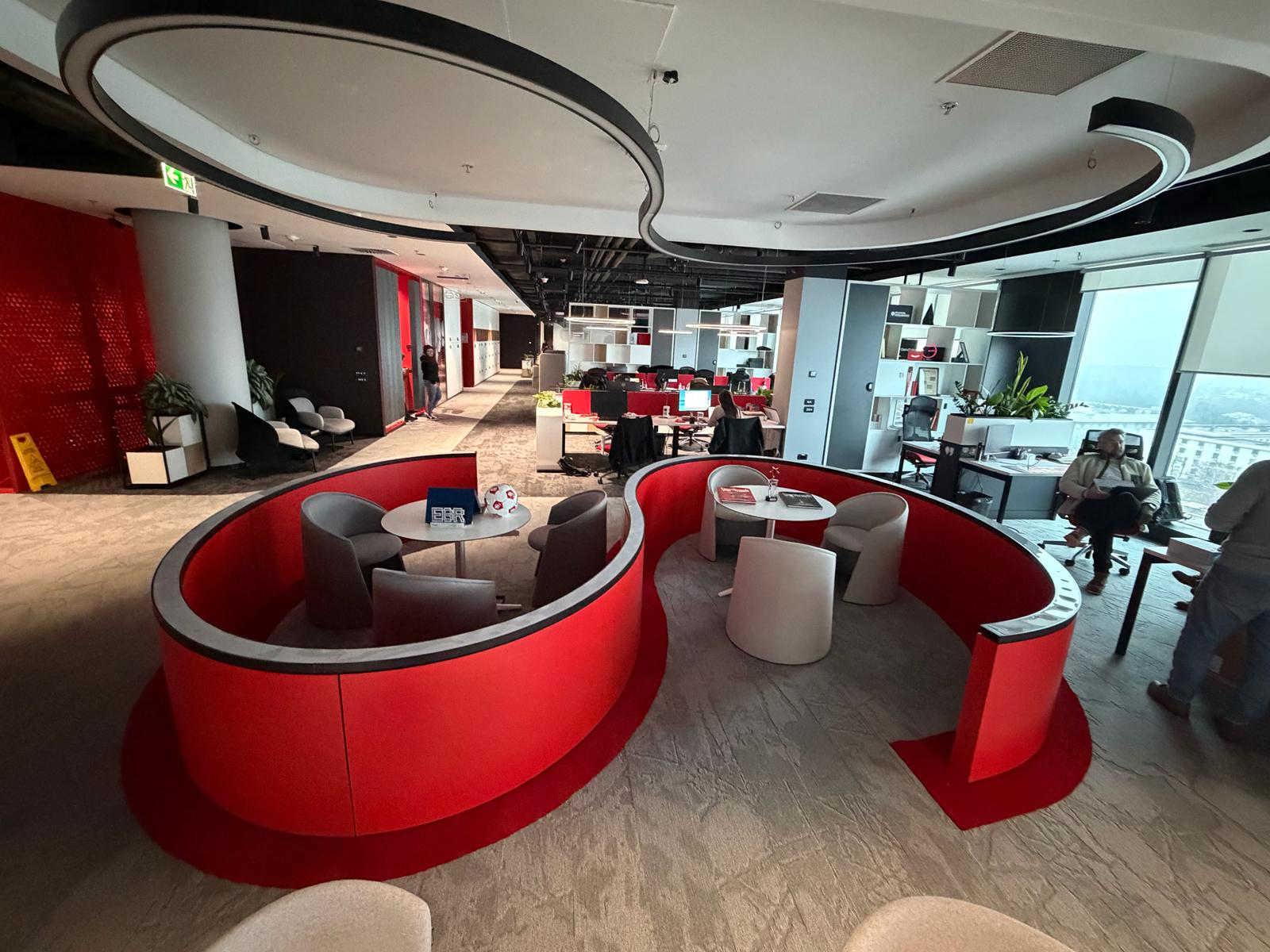 luxury interior design for an office the red parapet stays the s shaped red carpet stays the s shaped black suspended lamp is gone from the parapet to the ceiling there are rifling of wooden texture in the middle the rifling are more frequent with hanging plants between them on the ends the rifling are rarer and have vertical led lights strips that emit a warm lights also on the ends there are randomly placed glass and wooden texture shelves with decorations and trophies the chairs and tables and all the other furniture stays in the exact same place the led strip light casts warm light and shadows all elements have sharp details