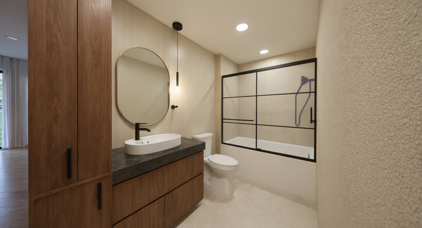 render a photorealistic image of a 2 storey clubhouse amenity building in a west coast contemporary architectural style maintain the exact existing form massing rooflines windows and proportions no architectural or structural changes update only the material palette and colours to reflect west coast contemporary design principles warm natural cedar or wood cladding used in accent bands or vertical sections charcoal or dark grey fiber cement panels or smooth stucco for contrast matte black or dark bronze metal trim and window frames neutral concrete or stone base with a natural texture balanced mix of earthy greys warm woods and black accents lighting soft afternoon daylight with natural shadows that highlight texture and material contrast context subtle landscaped foreground with native grasses evergreens and clean hardscape consistent with west coast design emphasize realistic materials depth and warmth ensuring the composition feels modern yet inviting