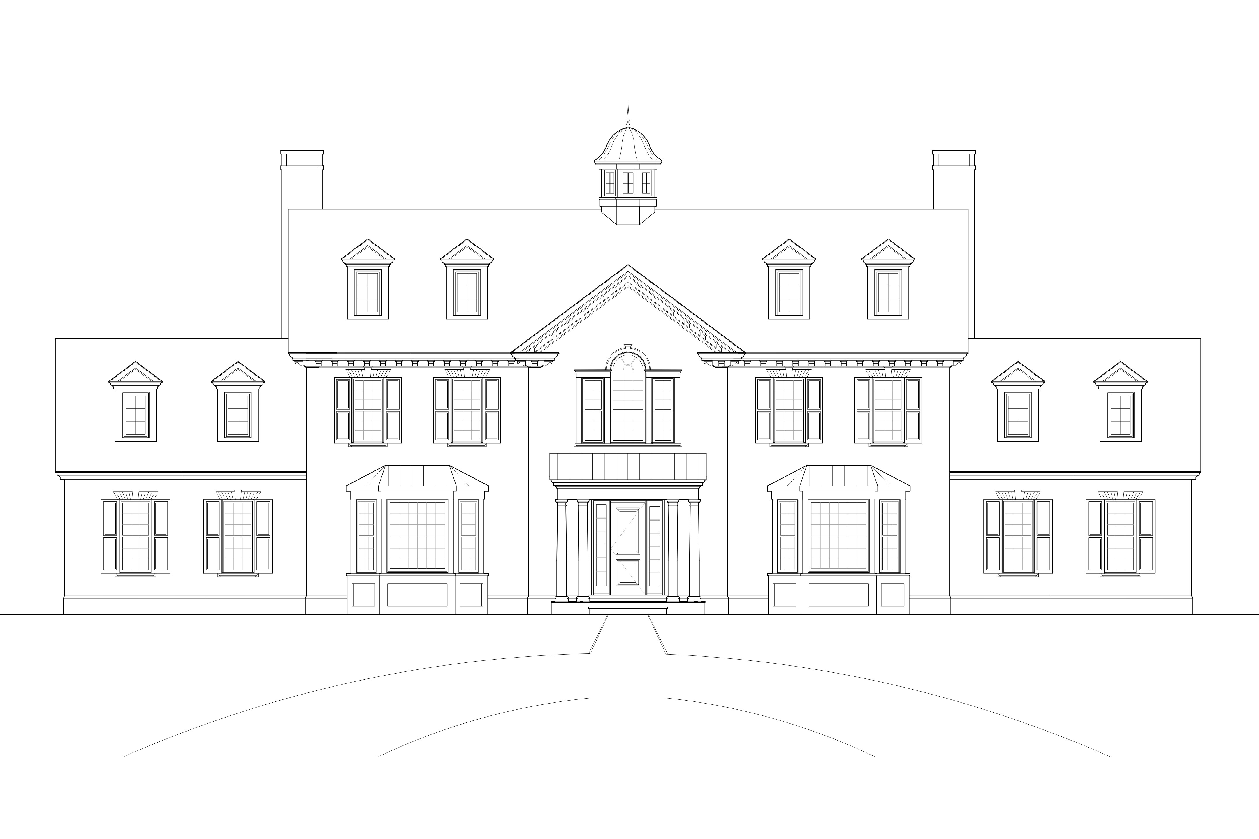 exterior shot exterior photo of a georgian revival style home with white windows red bricks black shutters dark slate roof and landscaping in front of the house