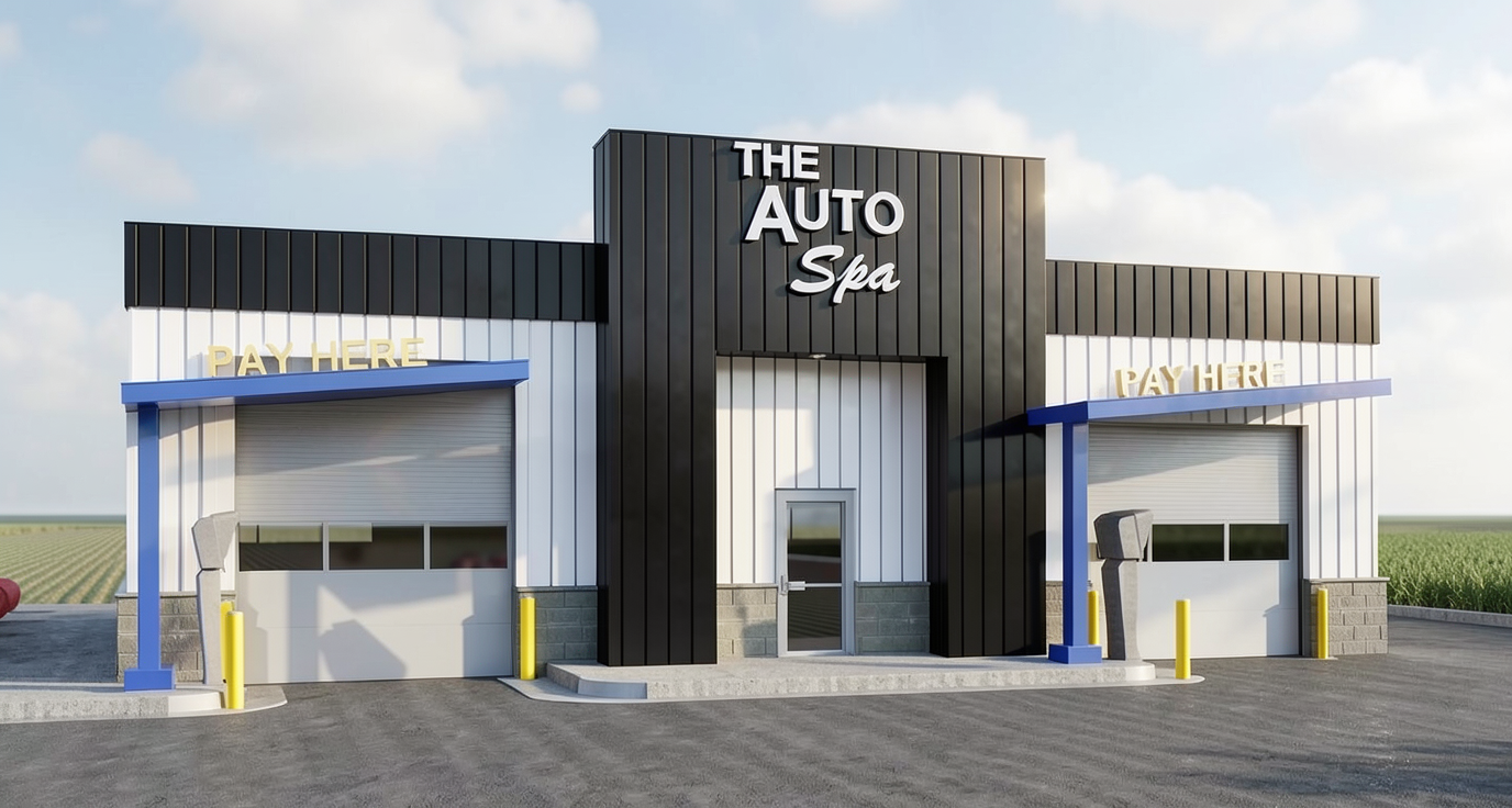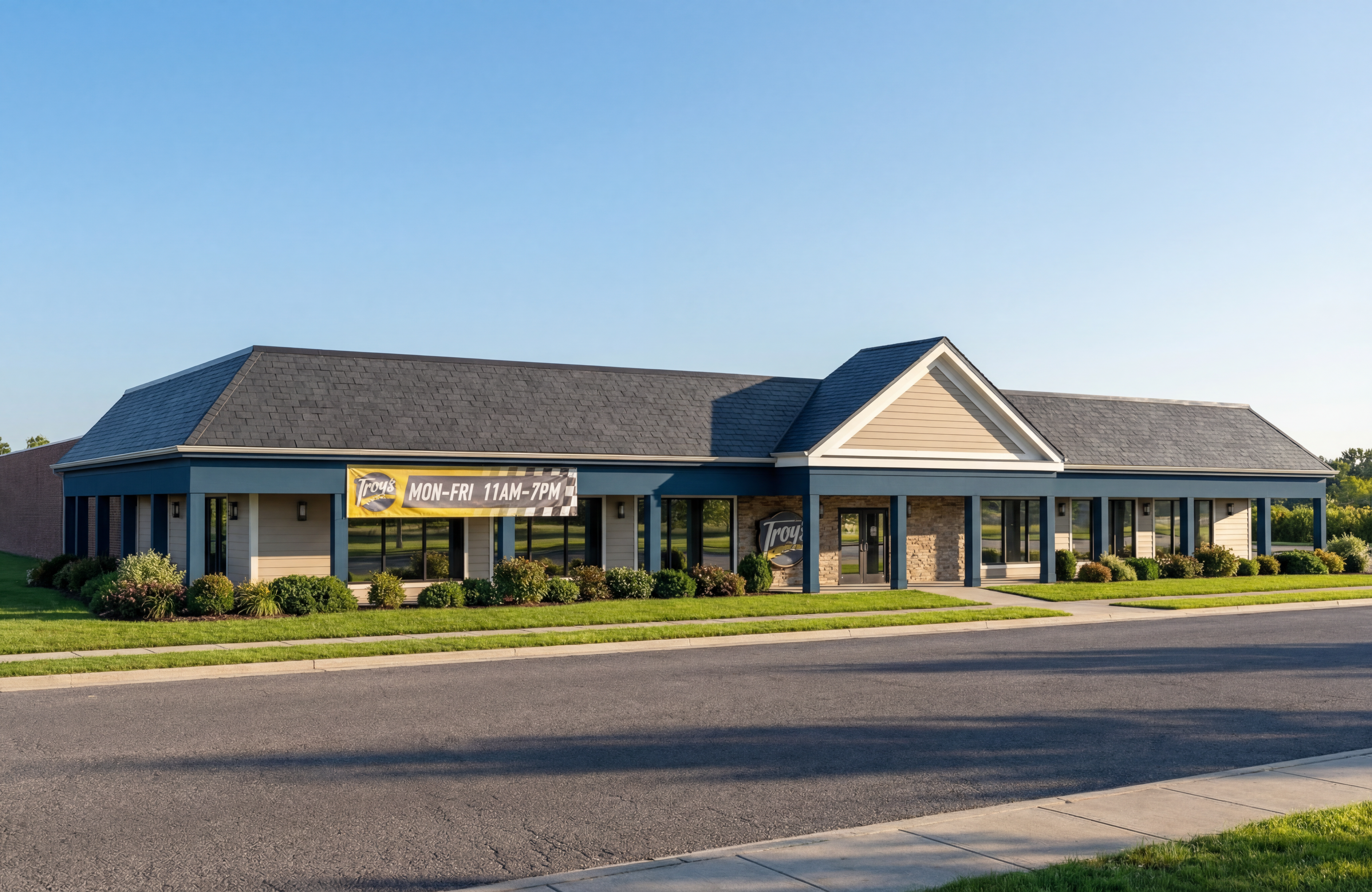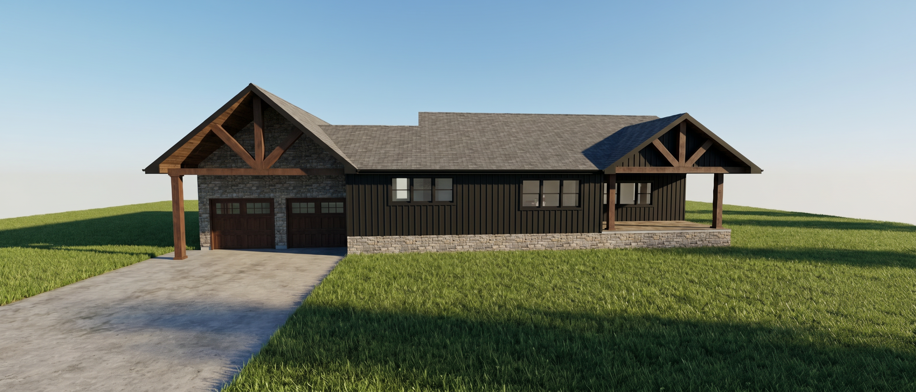 black white part vertical panels blue overhangs