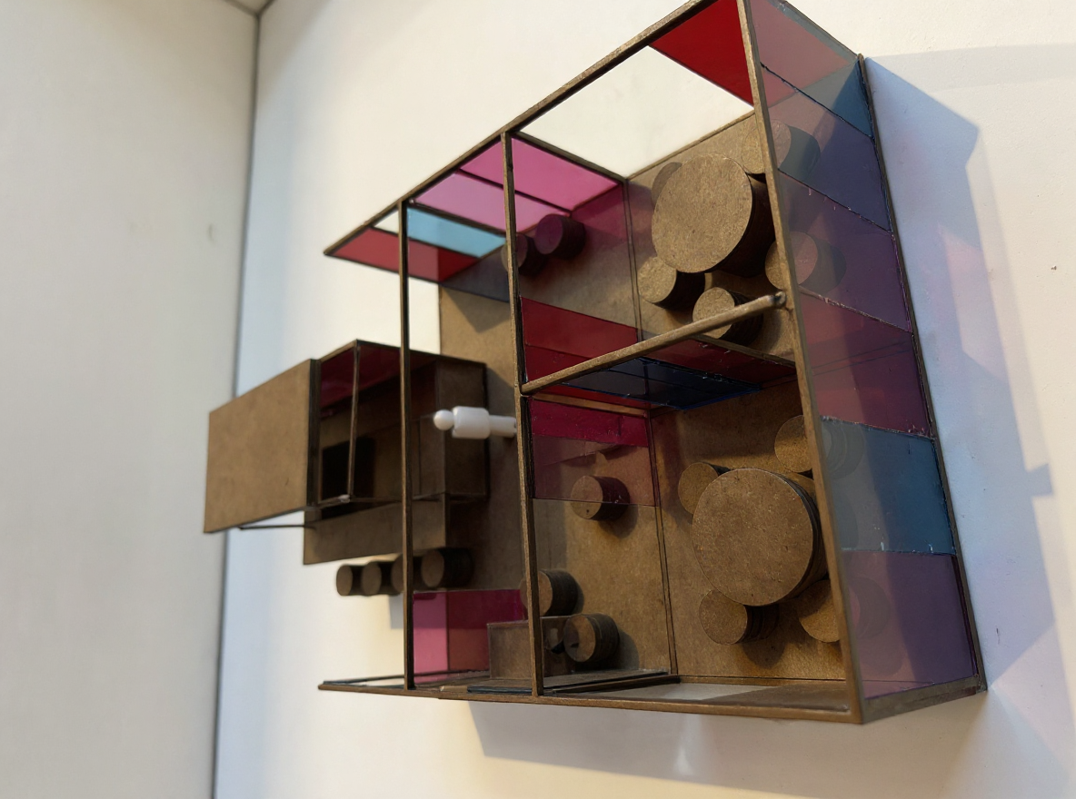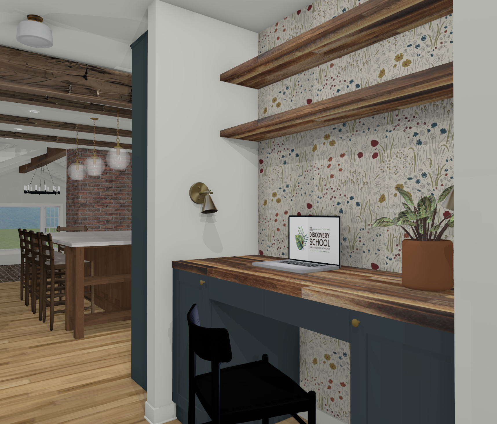 create a photorealistic rendering of this desk area with warm bright lighting