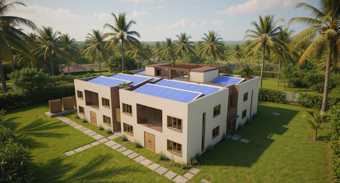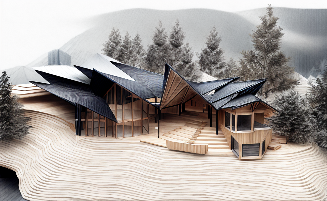 black cladding black roof black window frames lawn low timber deck extensive native planting background trees sunset