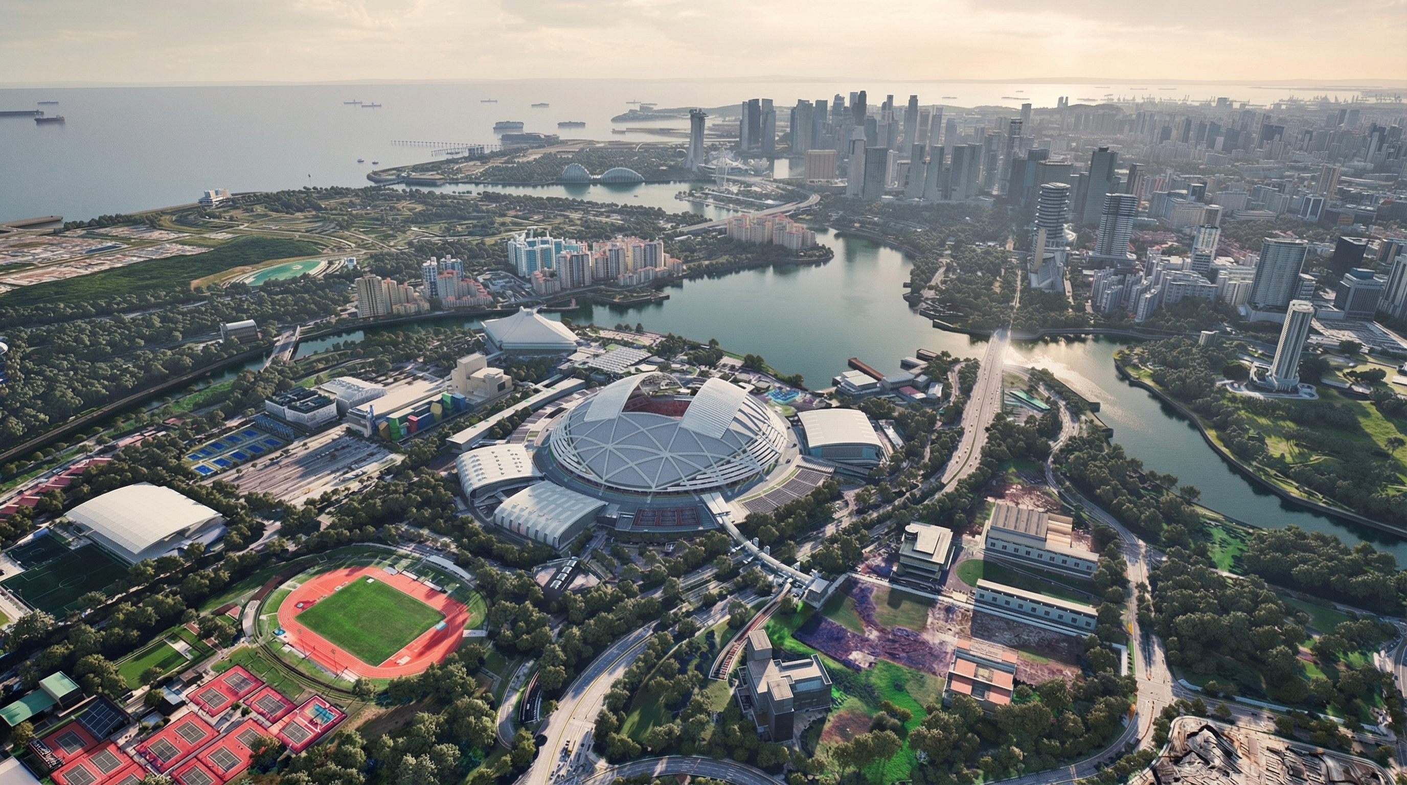 a render of a night installation at the singapore national orchid gardens water effects illuminate the space creating an immersive underwater effect a hybrid creature made out of an abstract manta ray that has orchid like features float across the airspace the creature spreads pollen around the space that looks like fireflies people watch from the sides