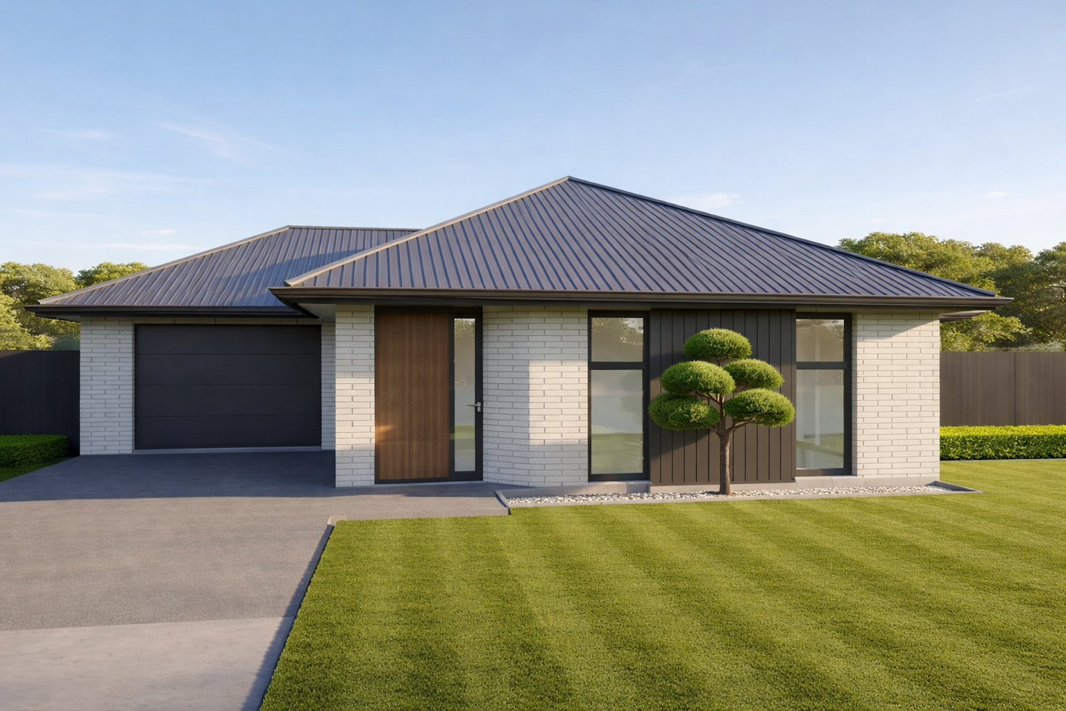 add right hand side fence black grey brick small rhododendrons and some taller trees on the left side no grass