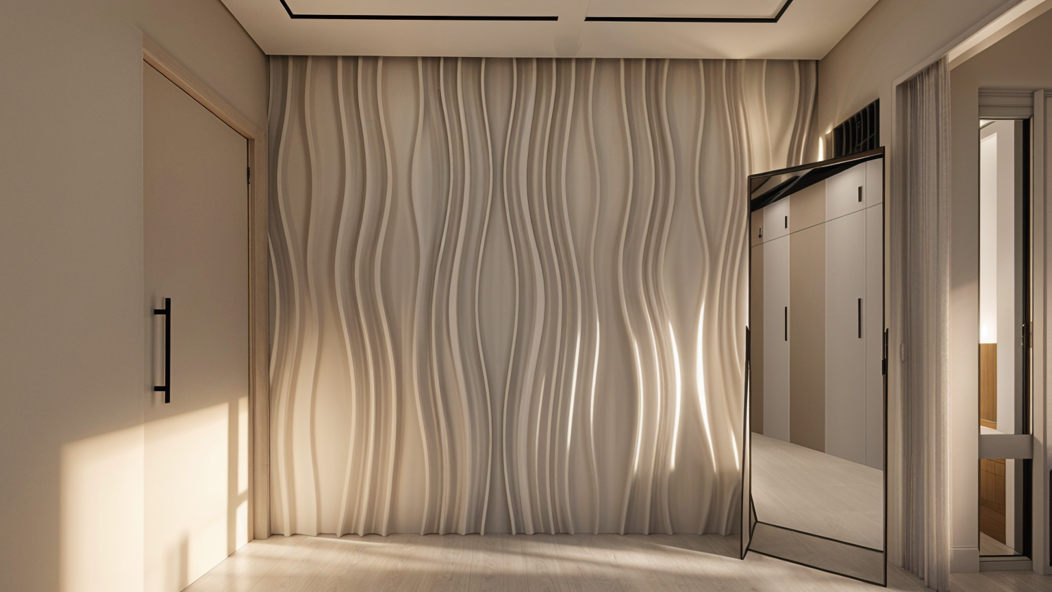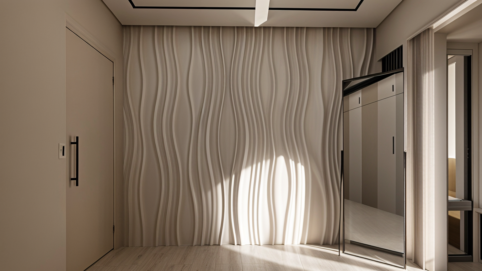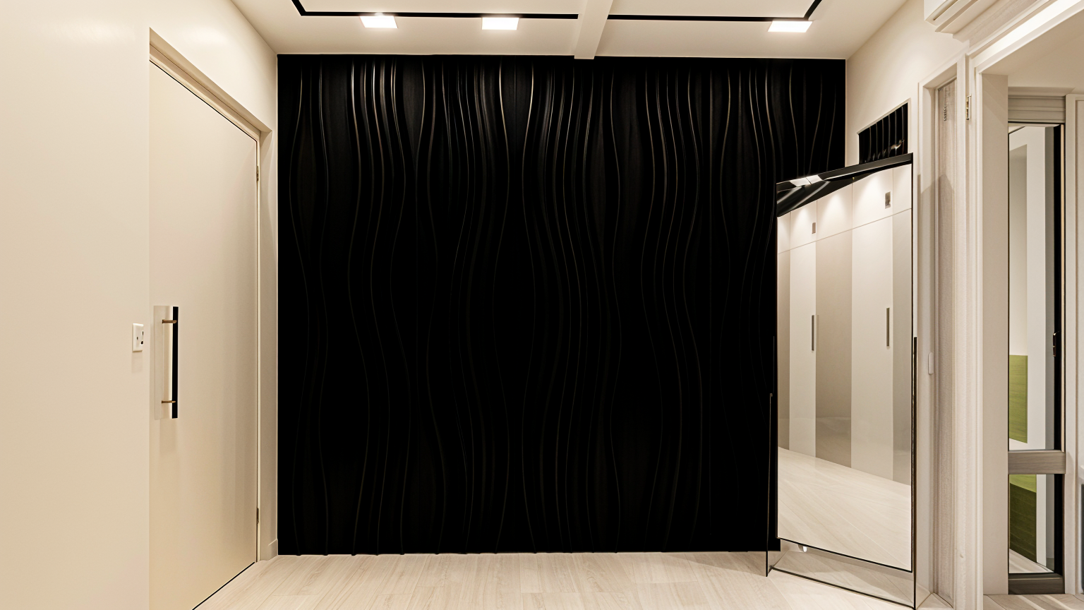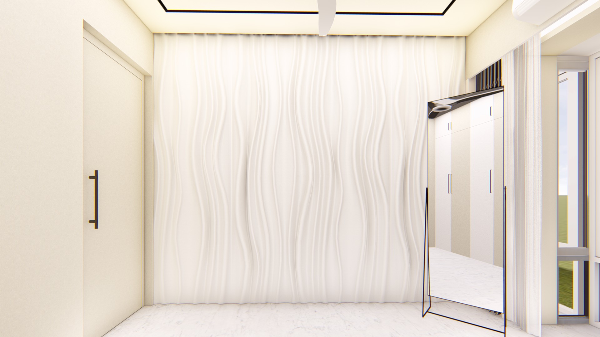 donot change anything in base image enhance it and make it luxurious and well it its a ceiling fan in the center wavy wall texture is not curtain curtain is on the rightside window should be black
