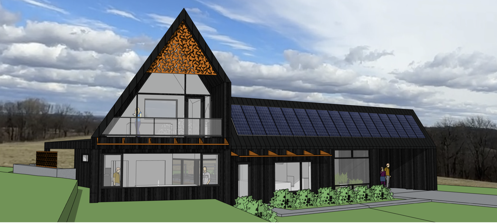 photorealistic architectural rendering preserve the exact building geometry rooflines window locations and overall massing with no changes preserve the exact original camera position framing crop and viewing angle with absolutely no change blue cloudy sky in background trees to the left of the building prairie landscape and trees in distant background native landscaping along the front of building
