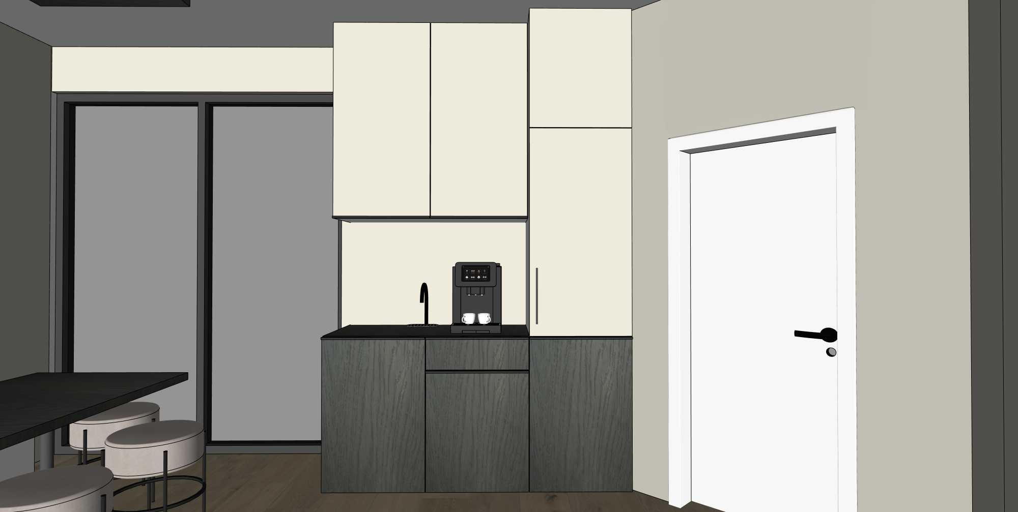 transform this sketchup screenshot into a professional photorealistic architectural visualization do not change the design architecture proportions layout perspective or composition in any way maintain the exact geometry materials and colors as shown in the original image do not reinterpret or redesign anything create a realistic lighting setup with a bright naturally illuminated atmosphere include soft natural daylight subtle sunlight direction and ambient bounce light combined with realistic artificial lighting from existing lamps or light sources in the scene all light sources should emit believable light and cast accurate shadows ensure physically accurate materials true to life textures correct reflections and realistic surface properties the final result must be sharp high resolution highly detailed and photorealistic preserve the original camera angle and framing exactly no stylistic reinterpretation only realistic enhancement