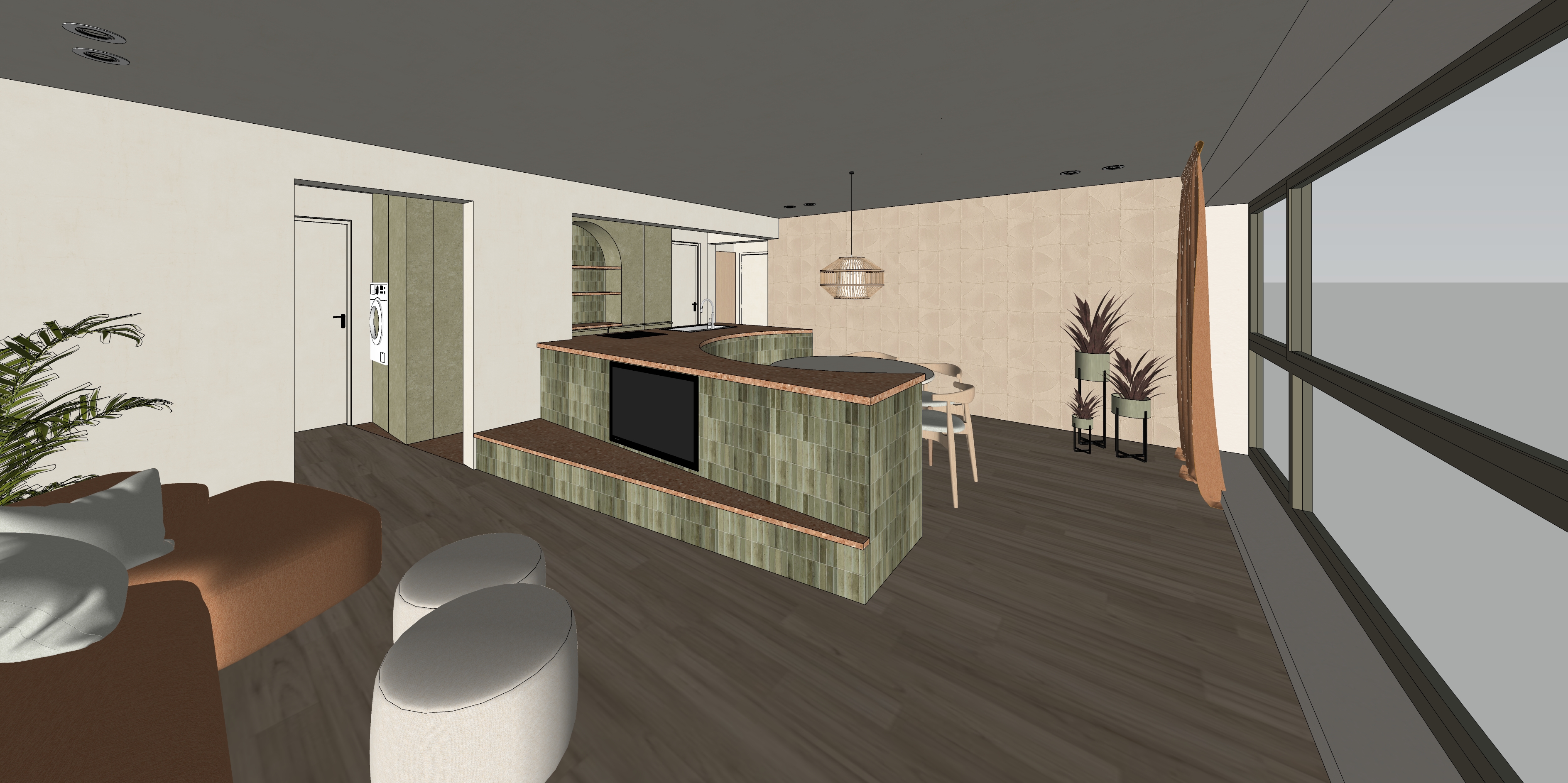 add belgian coastline view trough the window the wall behind the three plants is covered with wallpaper add golden hour