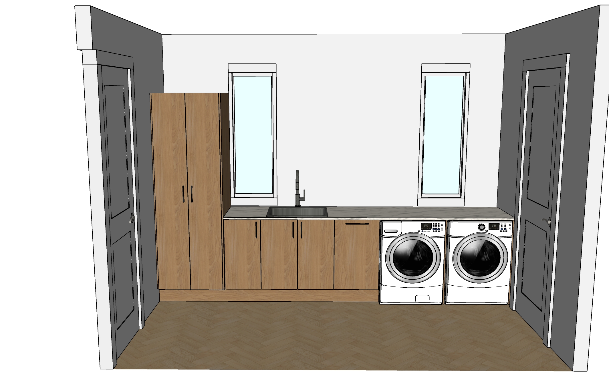 cabinet veneer is spotted gum door on left is cavity slider door on right is glass swinging show a view of garden out windows make the room filled with natural light