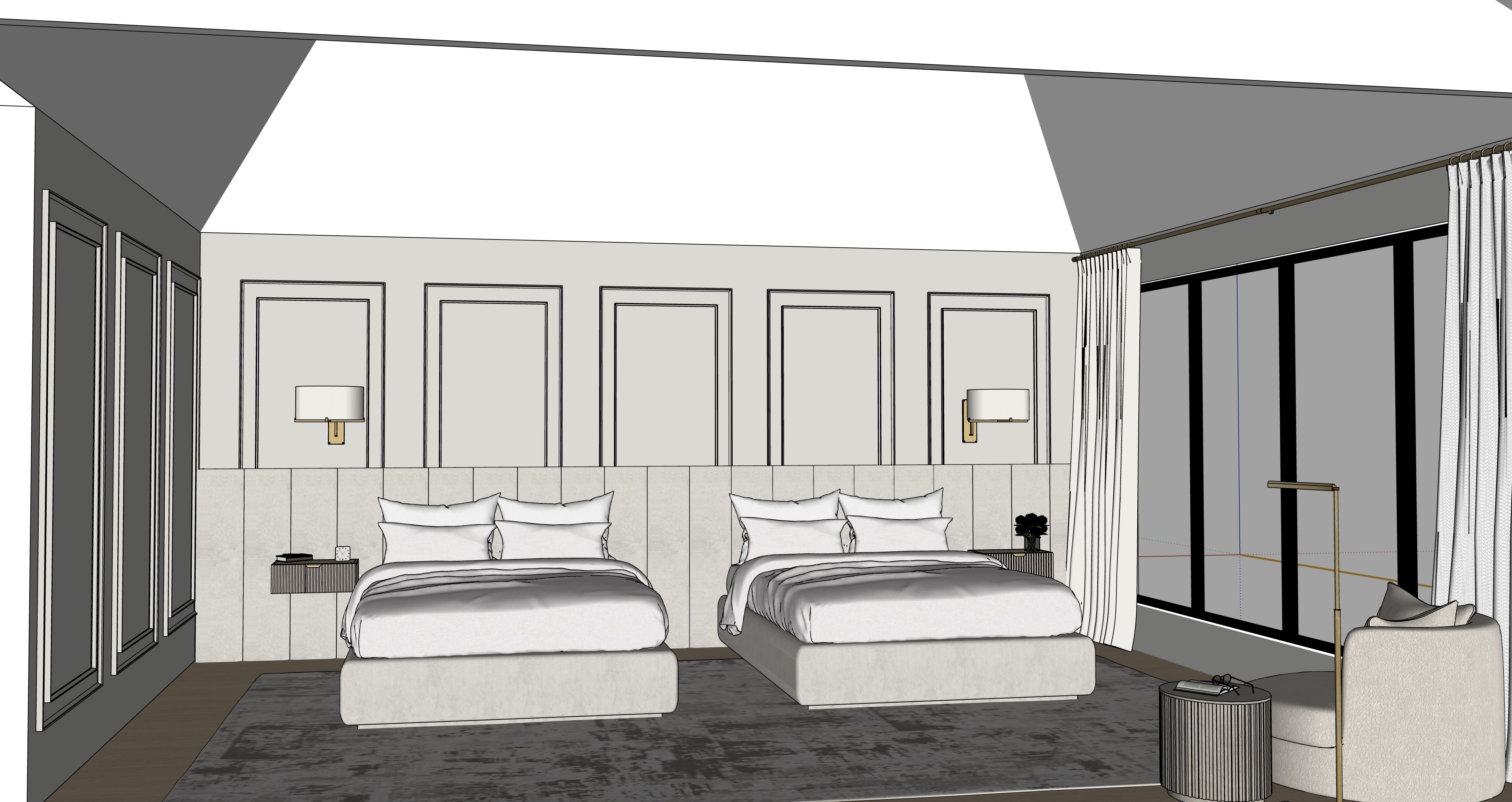 make drawing into a photorealistic serene bedroom with two comfortable beds and slanted ceilings and box molding on the walls behind the beds and a long headboard across the lower part of the wall a wall sconce next to each bed architecture