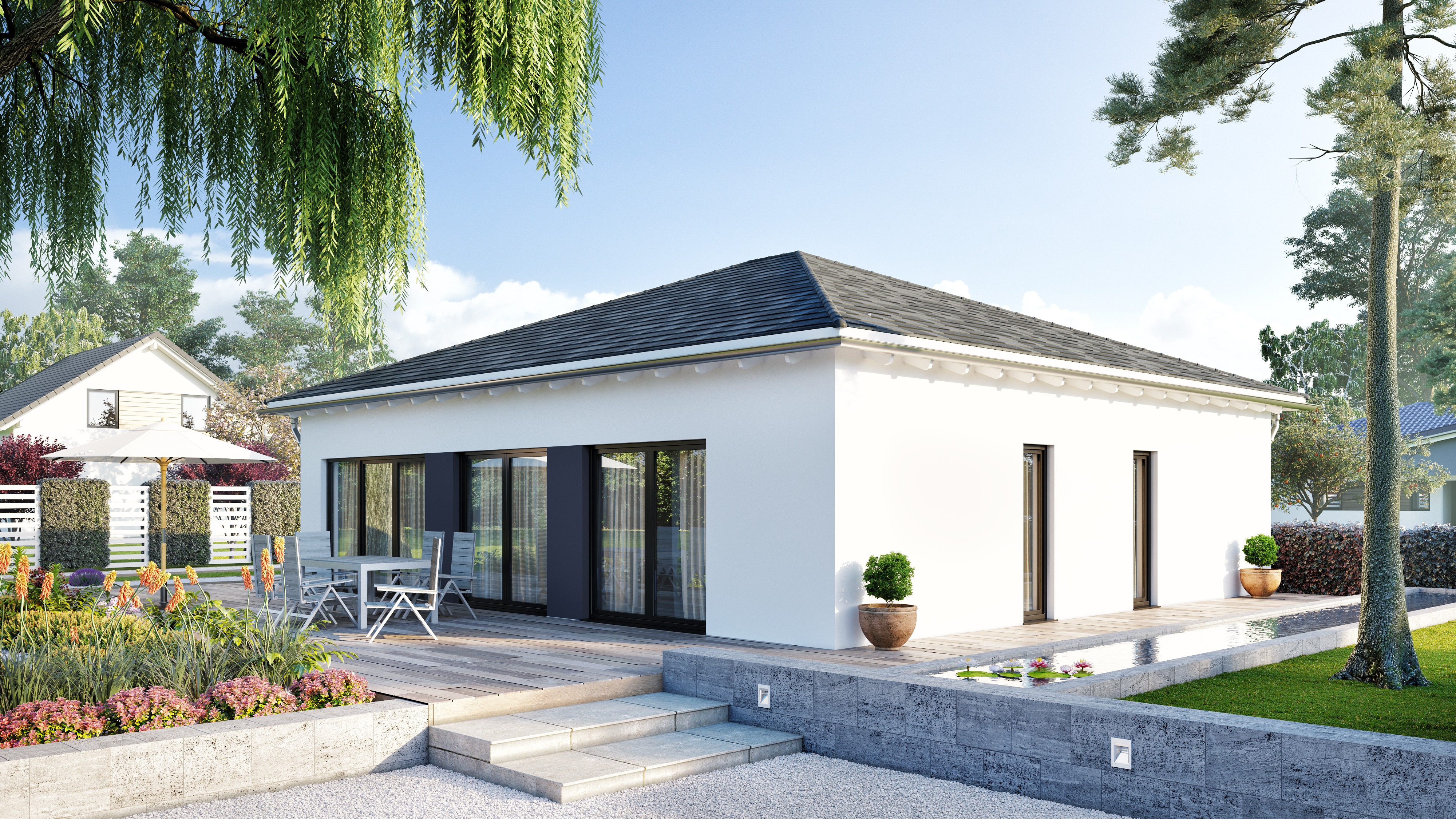 the image shows a bungalow with a hipped roof please change only the roof shape from a hipped roof to a flat roof which will not be visible in the image instead the house will receive a 30 cm high continuous parapet with a 5 cm high anthracite grey covering where the hipped roof is currently located