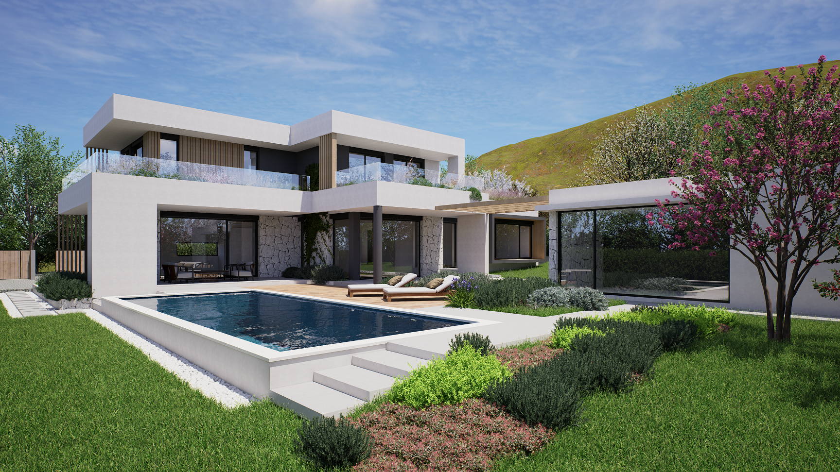 international style exterior shot prespective view of minimalist villa with white color facades architecture