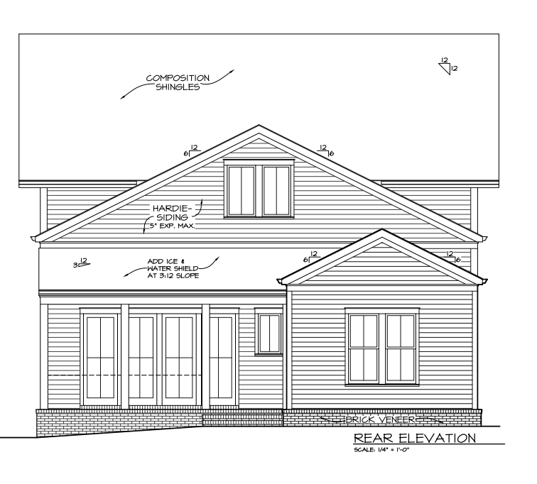 modern suburban house with a warm inviting atmosphere the siding is a soft neutral gray balanced with white trim around the windows and edges for a clean look the roof features composition shingles in a deep charcoal color adding contrast the brick veneer base is in a warm reddish brown grounding the structure the windows are clear glass reflecting the surrounding greenery the front door is painted in a rich navy blue to add a touch of elegance the overall ambiance is cozy and welcoming set under a bright clear sky with soft ambient lighting this is a rear elevation of the house