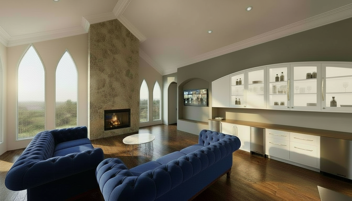 create an elegant victorian style living room with white trimwork the windows should have a soft rounded peak at the top the rich hardwod floor should have an ornamental rug over top with two sofas and a coffee table the cabinetry to the right should feature glass upper cabinets across the entire span of cabinetry there should be an elegant chandelier centered with soft white lights the fireplace should feature white panels and elegant white stone there should be a white mantel and stone hearth