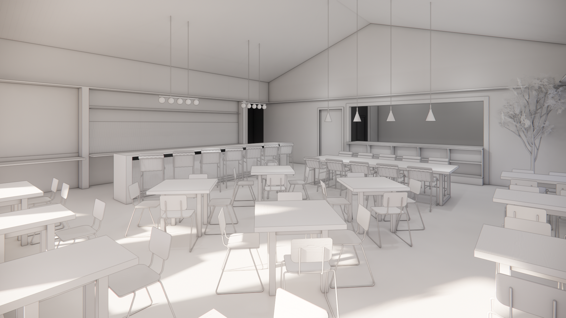 interior shot concrete floors wood ceiling and the space should feel rustic but earthy with muted greens and terracotta tones make the bar more playful as well