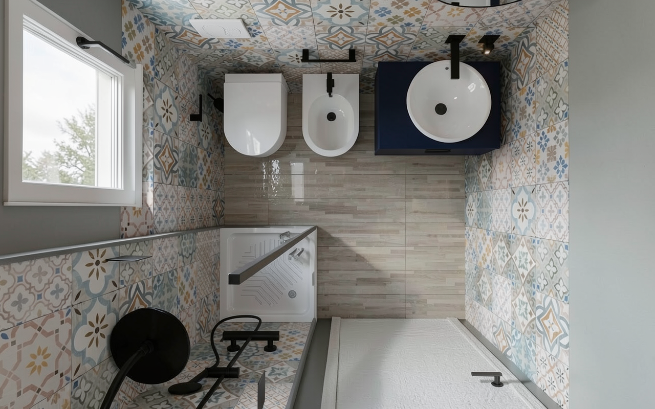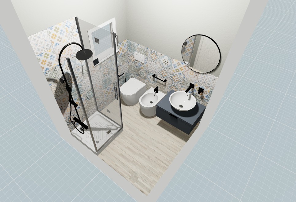 mobile sotto il lavabo blu navy profili box doccia neri illuminazione naturale