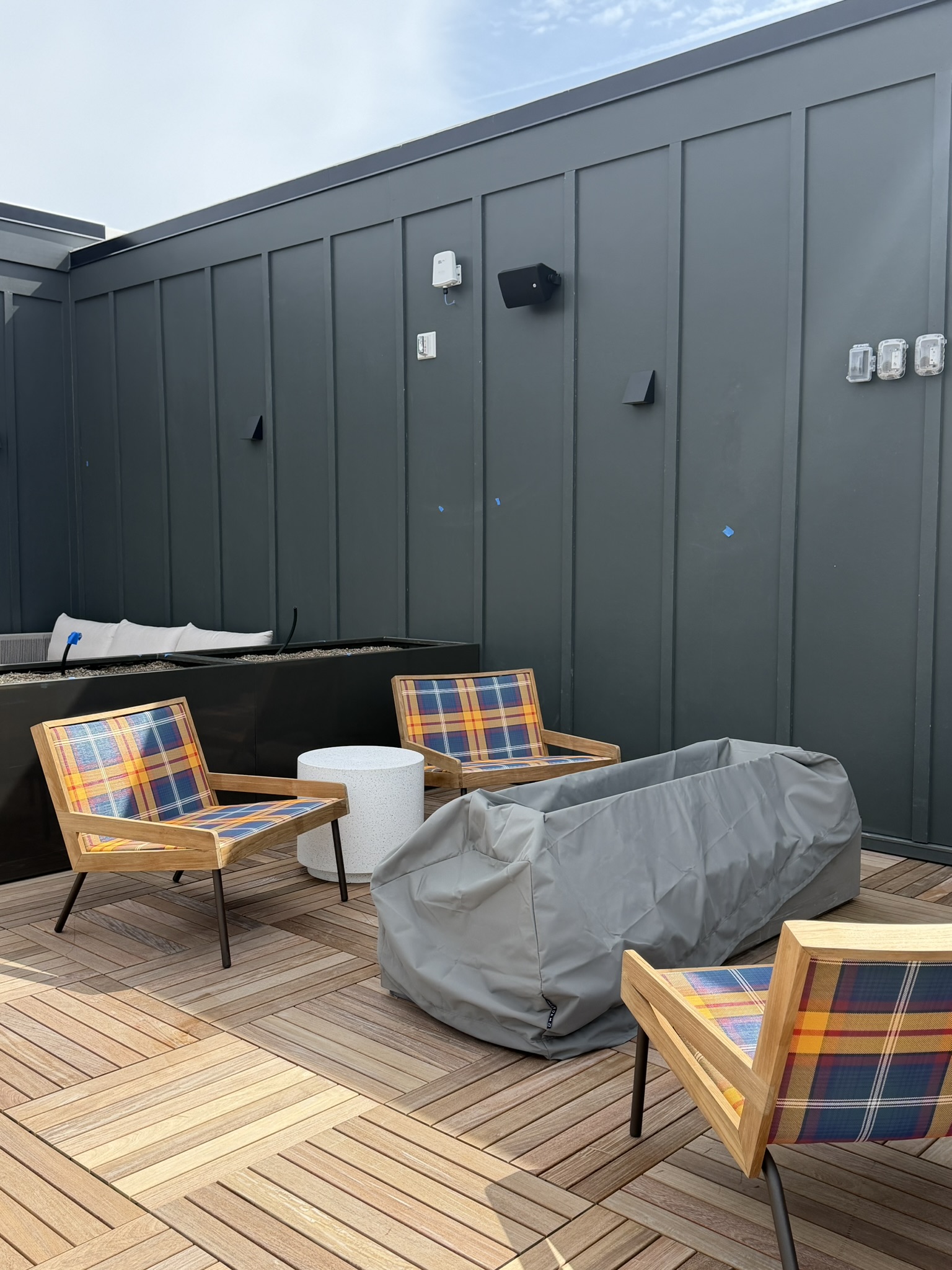 realistic outdoor rooftop patio show plants in the black planter that is located behind lounge chairs on the right side of image plants should be suitable for new england location remove grey fabric object in the center add firepit in the center of image