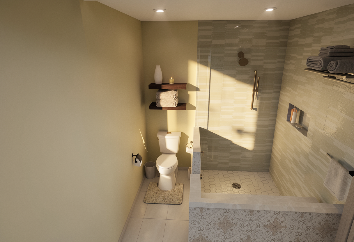 provide a photorealistic rendering keep all the elements proportions and materials as they are provide delicate daylight through the glass only add linear wall wash illumination at the bronze wall