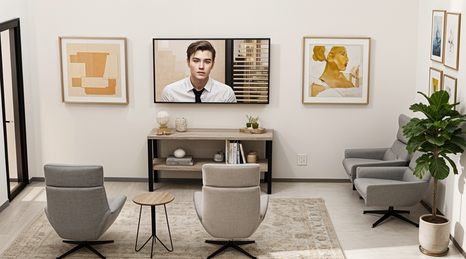remove the perforated sheets behind the tvs and the world map on the left wall are two vertically mounted tv screens displaying corporate items on the right side is a world map