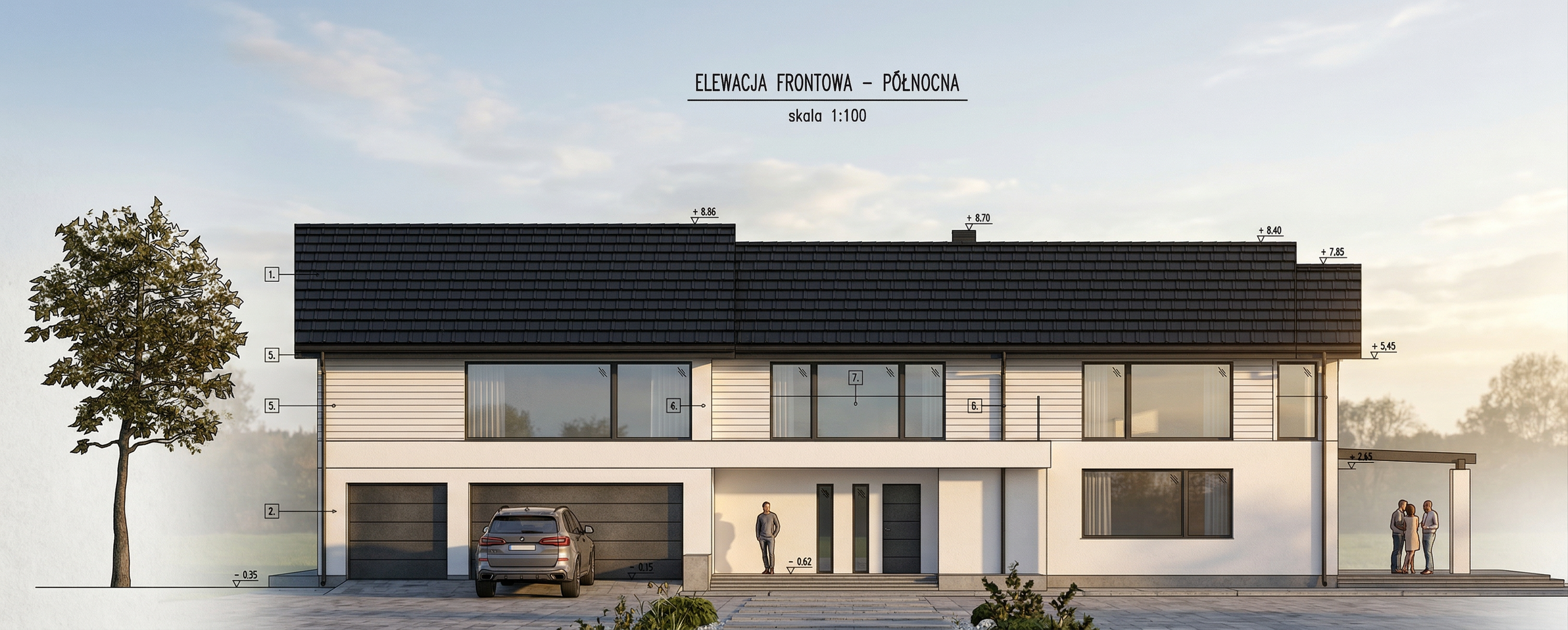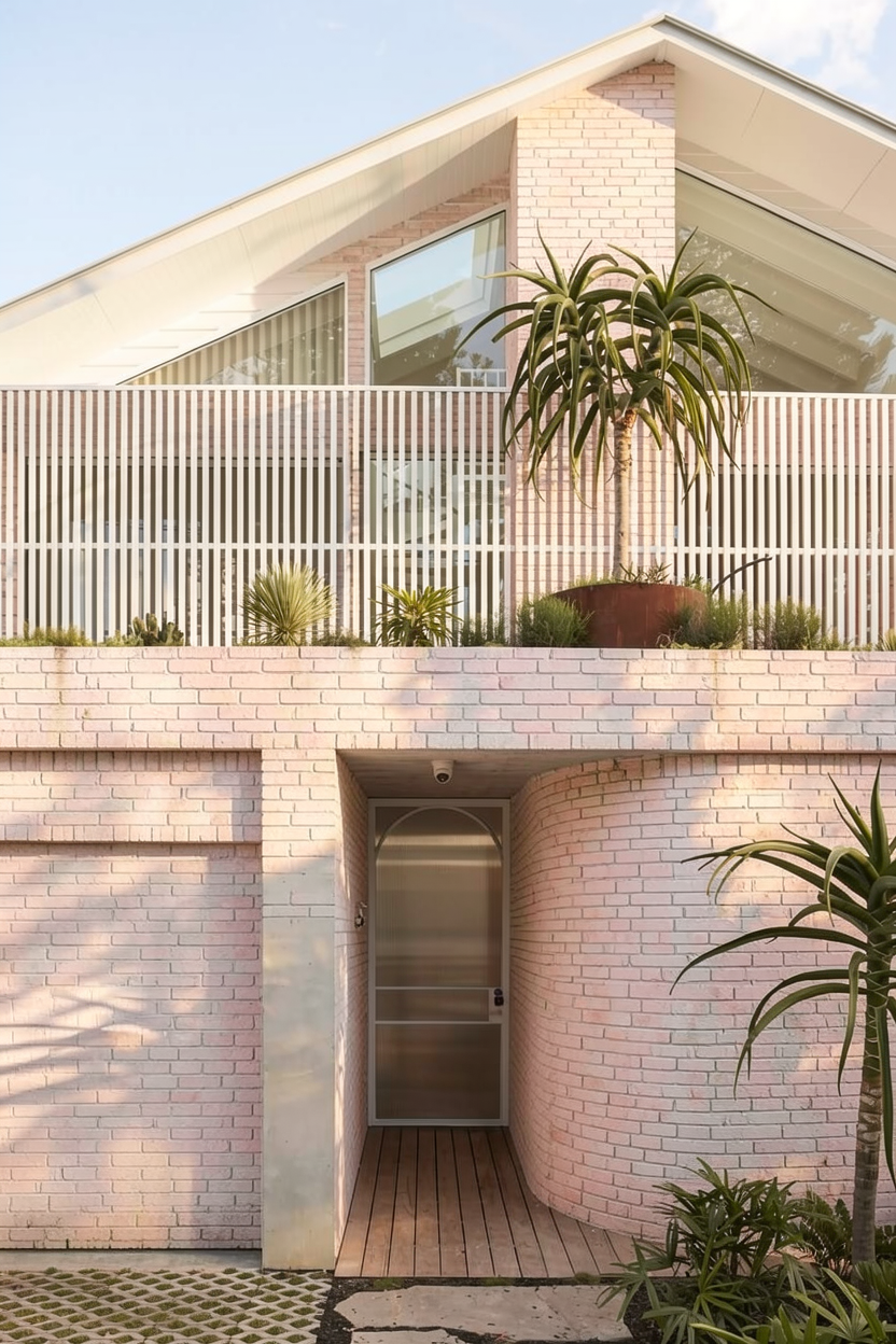 czerwona elewacja i niebieski dach