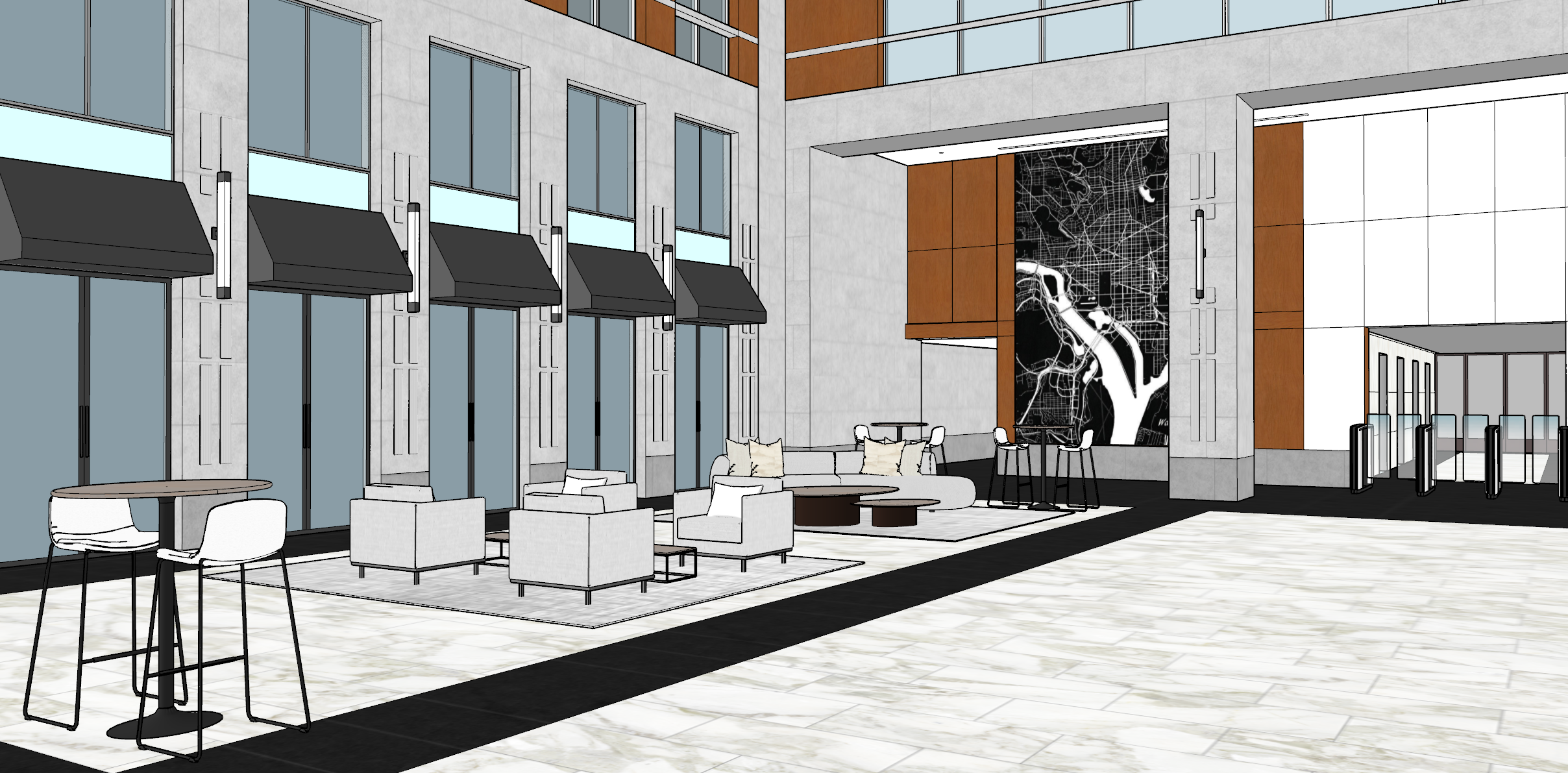 render this atrium lobby realistic keep all windows opaqued open lower level doors to a modern chic cafe that serves the lobby with upscale people enjoying a coffee lounging on the furniture