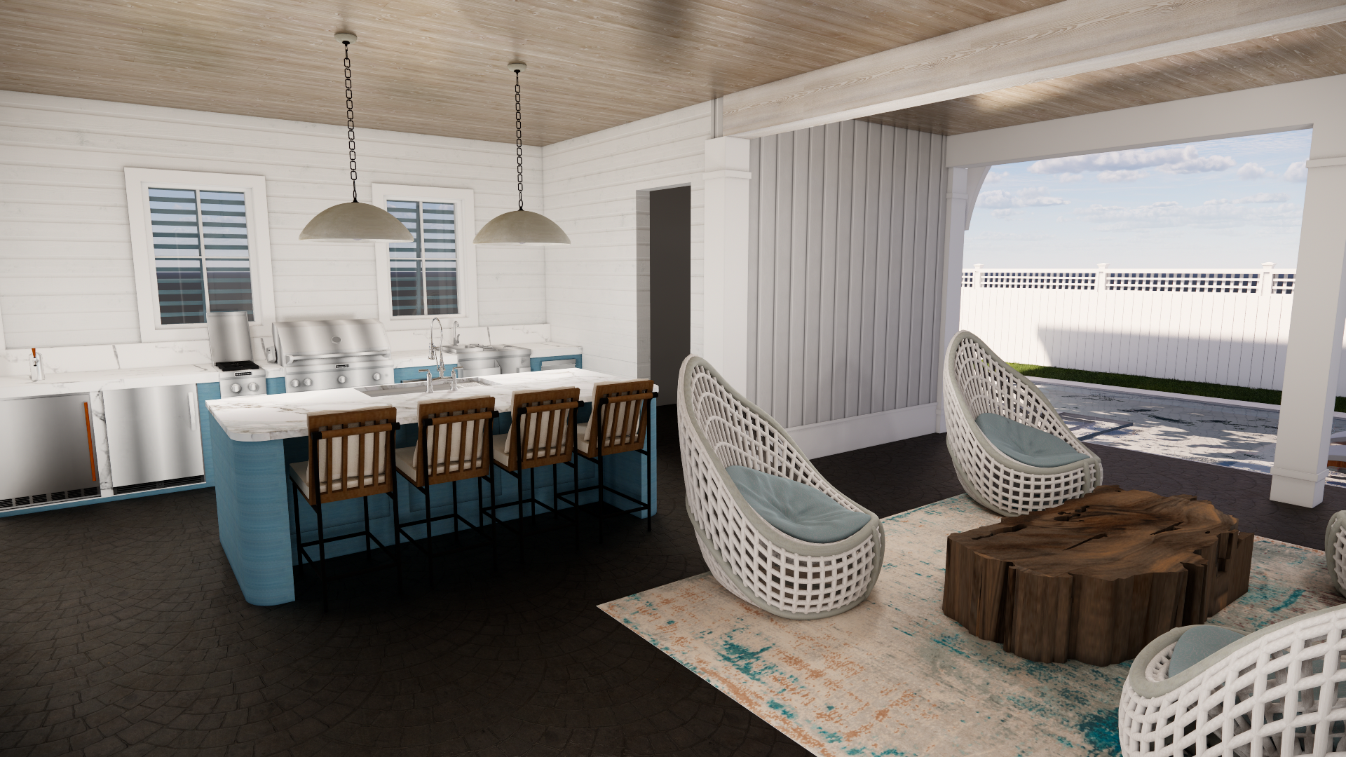 you are a professional image renderer you create the highest grade renderings around and specialize in architectural renderings this is an interior rendering of the ground floor of a beach house create a high resolution photorealistic image of this room keep the windows as they are where they are keep the doors as they are where they are keep the main structure as it is where it is feel free to change the perspective keep the ceiling as it is where is it do not add anything to the structure that i have not asked for it is sunny outside and there is a pool to the right