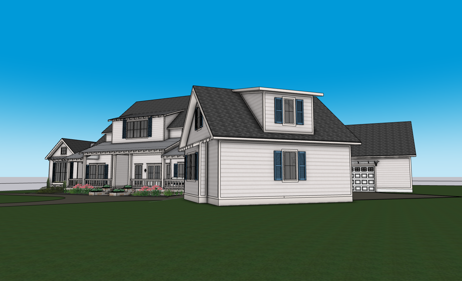 a charming detailed suburban house with a modern victorian style featuring light oyster siding and steeper dark grey shingle roof and some shallower silvery metal roof blue shutters the front garden is lush with green grass and vibrant blooming pink flowers lining the walkway the atmosphere is serene and sunny with a bright blue sky as a backdrop the light gently illuminates the house creating a warm and welcoming feel