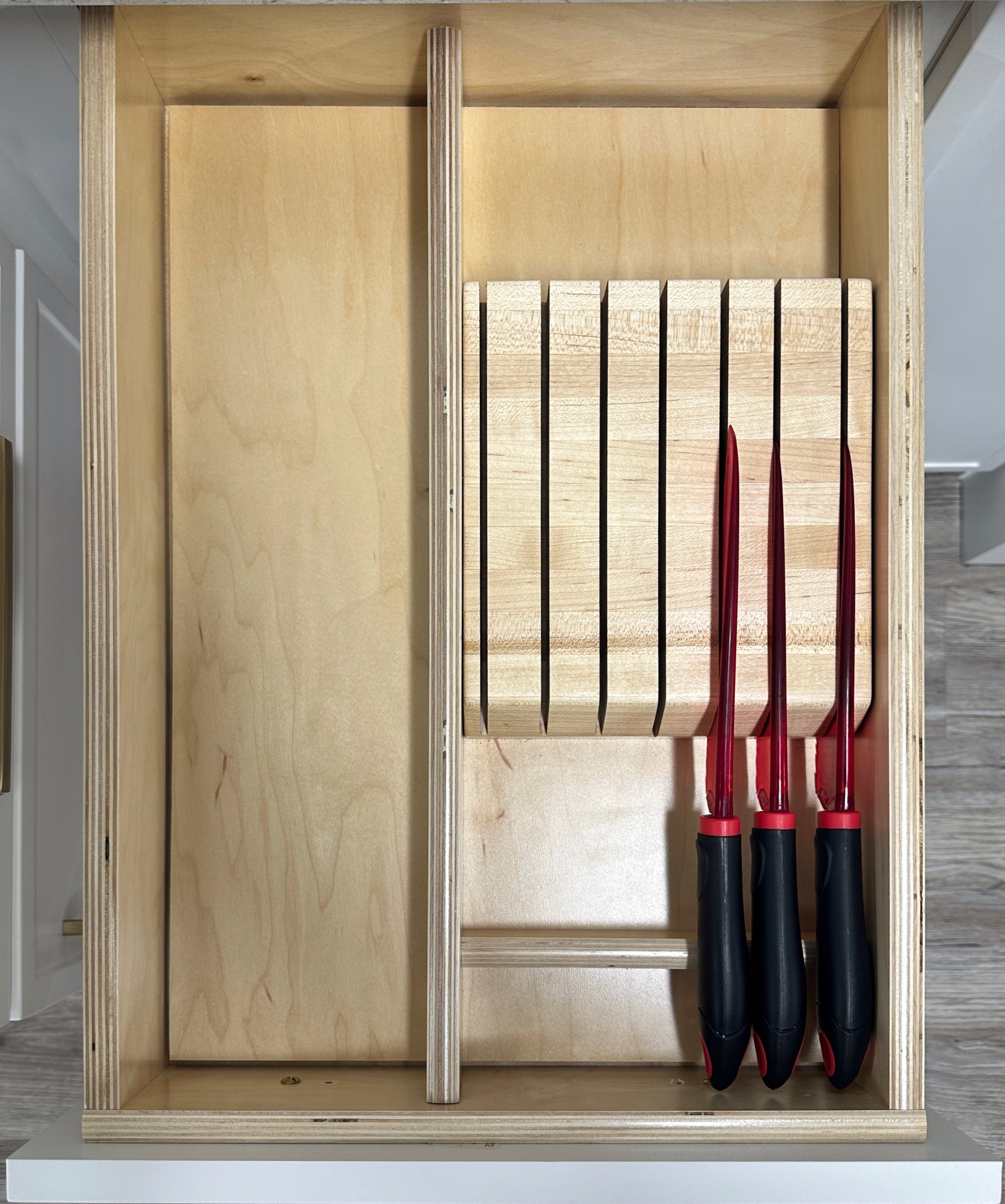 add more natural light blur the background so the focus is on what is inside the drawer replace the red knives with new ones in the same position and add utensils in the left side