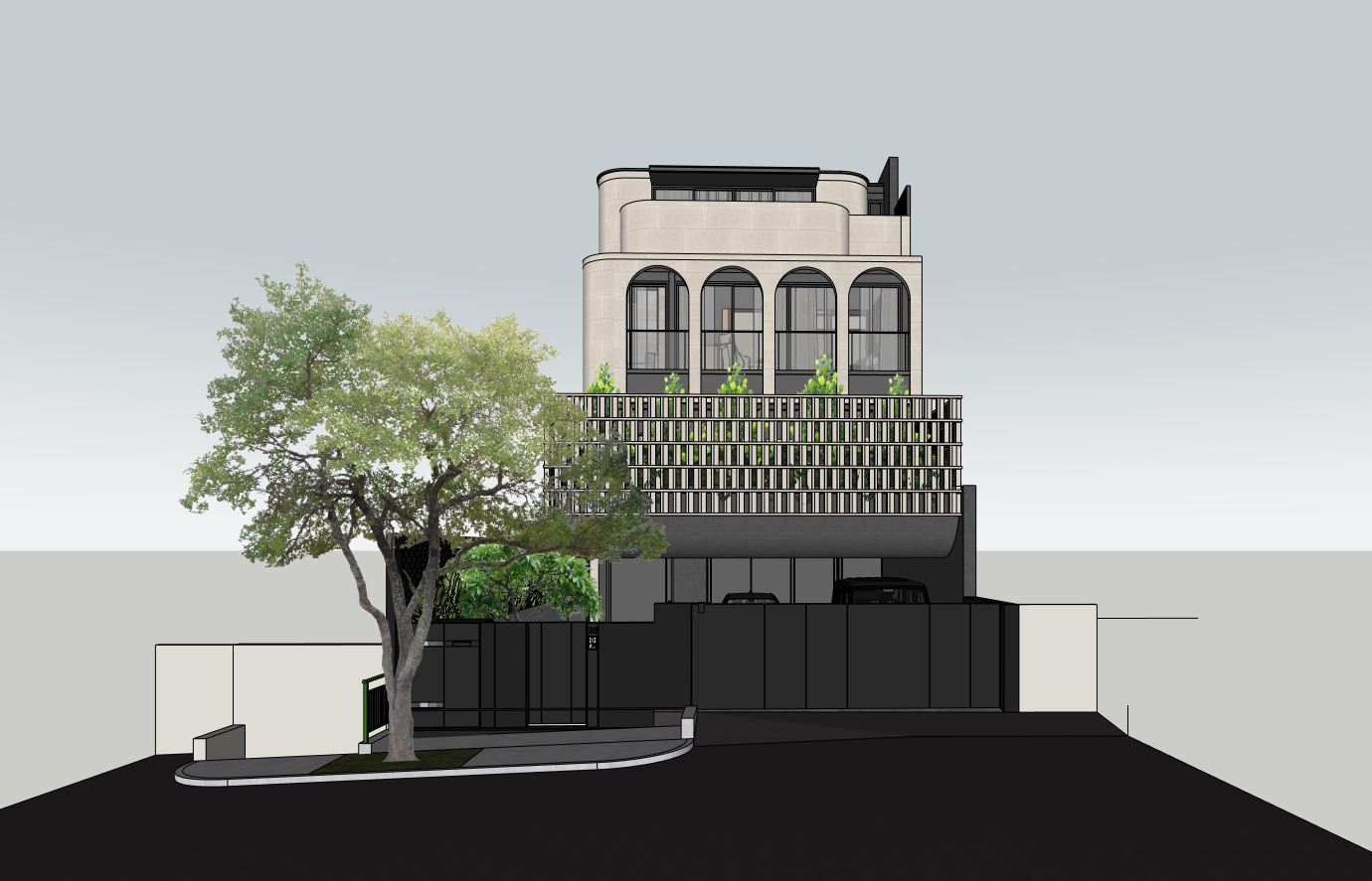 maintain the exact original architectural geometry proportions structural system facade articulation roof form column grid openings and spatial composition exactly as modeled do not redesign reinterpret stylize simplify exaggerate or alter any architectural elements preserve massing window sizes and positions structural rhythm depth of reveals shadow gaps parapets edge detailing all exterior screens must be in stone beige travertine identical to the main building facade in tone and warmth veining direction surface texture material finish honed lightly textured natural stone joint pattern and module the screens must feel integral to the architecture using the same material language and construction logic as the facade no contrast materials photorealism requirements ultra photorealistic architectural rendering accurate real world stone texture scale subtle natural imperfections in travertine correct material roughness and reflectivity precise edge detailing and thickness realistic shadow depth and light falloff no artistic filters no stylized color grading no cinematic exaggeration lighting soft neutral daylight late morning or early afternoon balanced exposure natural sky illumination true to life shadow behavior no dramatic sunset no over saturation no mood reinterpretation camera architectural lens 35 45mm equivalent natural perspective no distortion professional architectural photography framing goal high end competition level architectural exterior visualization with strict fidelity to the original design intent and complete material realism