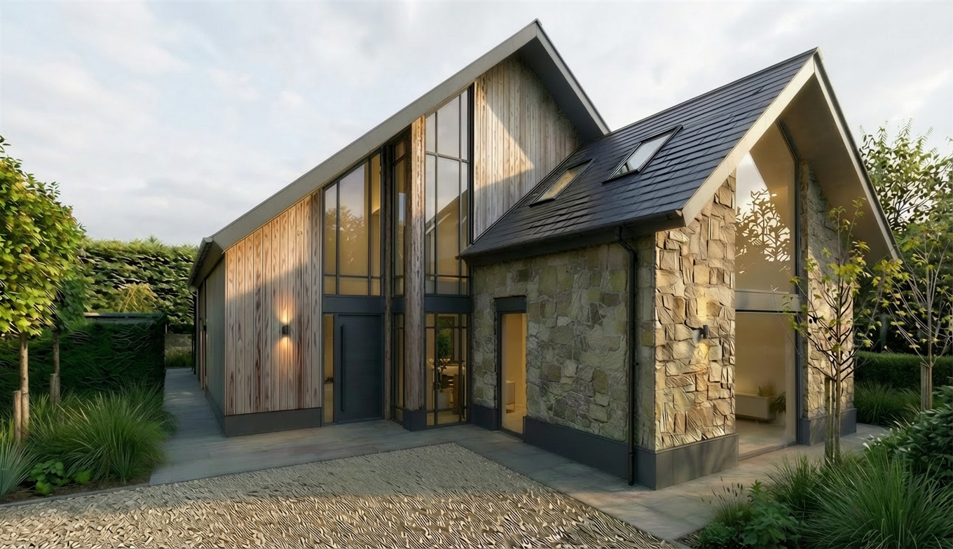white trim and off white clapboard siding white cottage mullions grey tone stacked stone veneer in place of the brick grey tone patio pavers shrubs bushes and flowers near the house trees in the background white wood furniture on the covered porch and people placed in the image to show realism and scale keep the image as close to the original as possible add a walkway from the middle of the stair straight out to the street widen the driveway and and keep the retaining wall remove the walkway down to the driveway and just show grass keep the image realistic