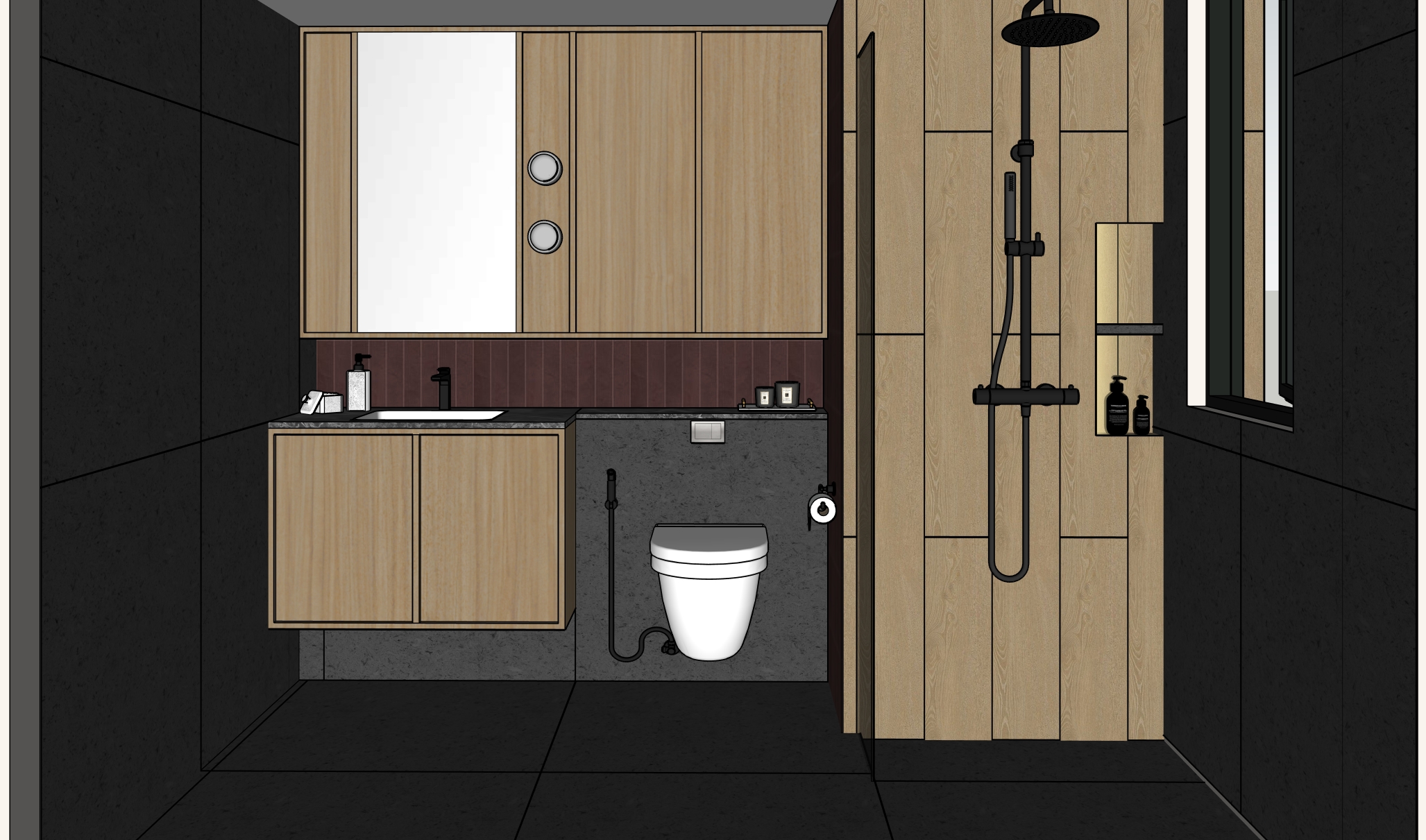 colours and texture to remain accurate as per original picture dark maroon purple matte subway tiles in between top hung and bottom cabinet shower wall in wood tile niche ledge in dark grey tile 2 lighted wall light at middle side led at shower niche