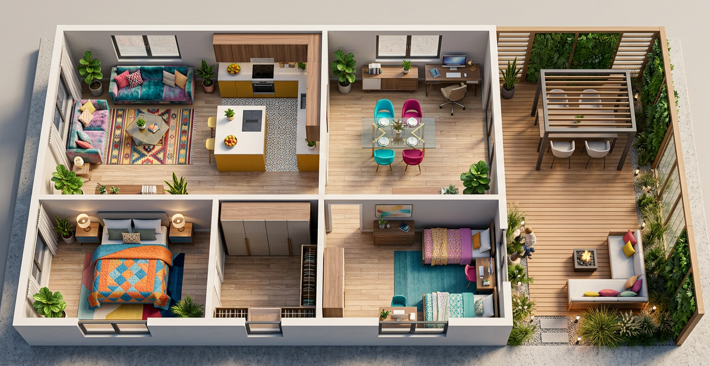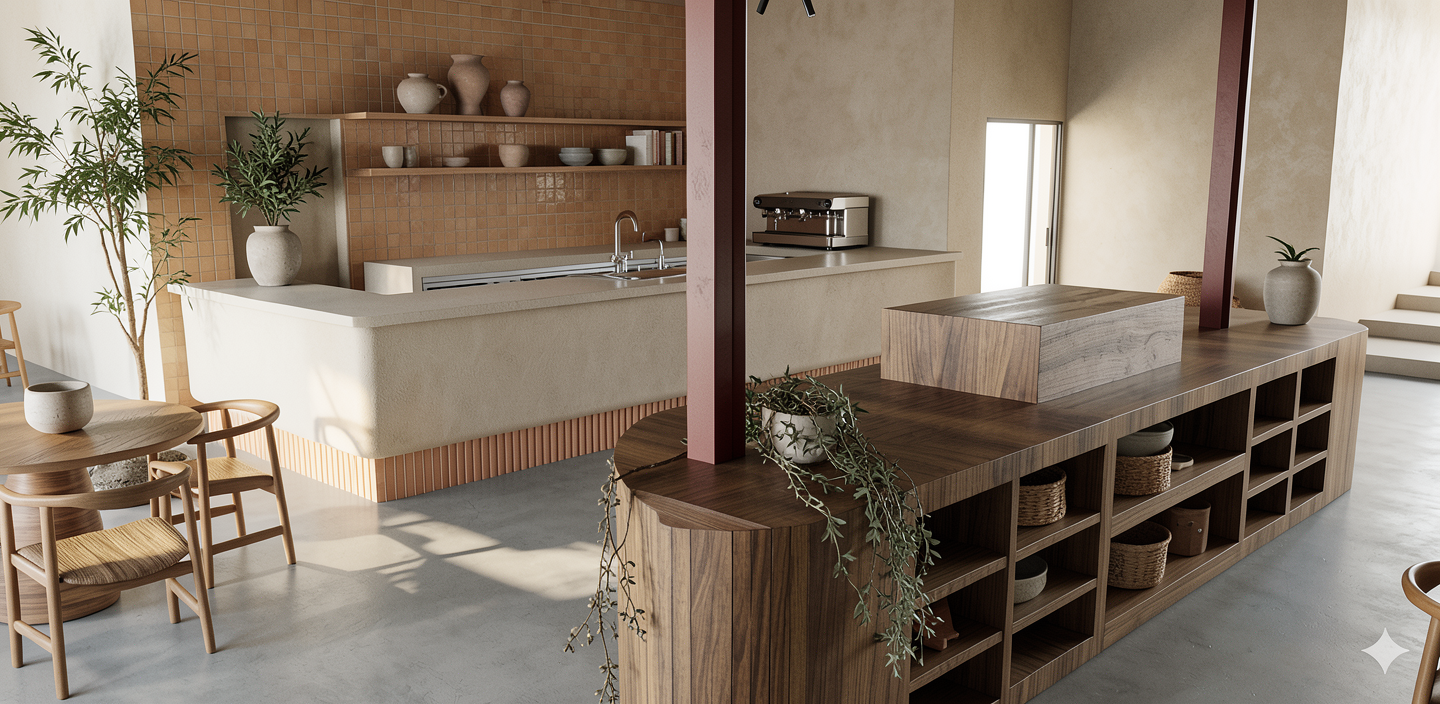 luxury modern kitchen design featuring black perimeter cabinets with visible graining and subtle brass handles the backsplash is made up of elegant multicolored slate tiles 12 x 3 in tones of gray and brown a sleek copper range hood complements the warm wooden tones of the center island and countertops both in rich walnut soft ambient lighting from stylish brass wall sconces creates a cozy and inviting atmosphere the wooden floor is a mediym stained wood adding a touch of sophistication natural light flows through large windows highlighting the harmonious blend of textures and colors the soffit above the perimeter cabinets and down the open shelving is a antique rustic medium wood keep original layout angles colors create a realistic photo