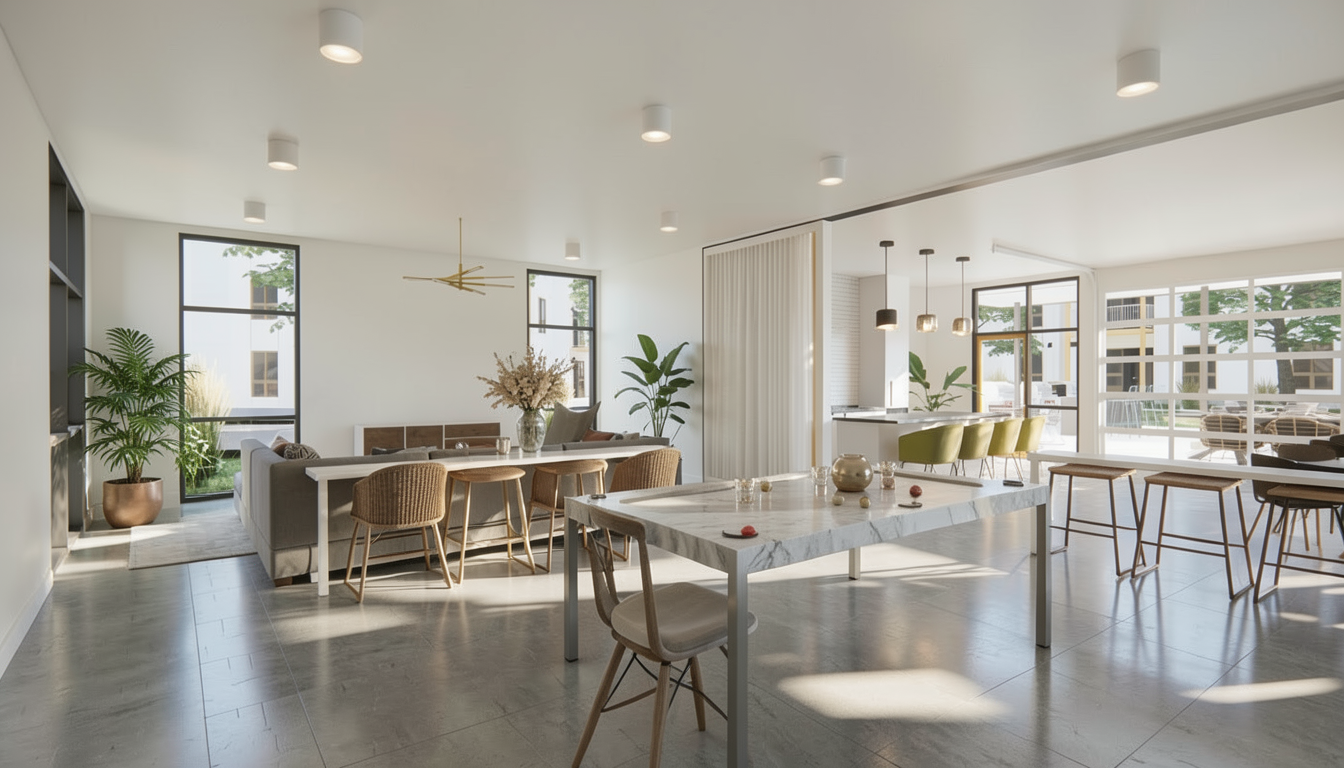 classical exterior shot a modern building with a minimalistic design featuring a sleek grey concrete facade large black framed glass entrance and floor to ceiling windows the outdoor area has elegant dark wood furniture under a stylish overhang surrounding the building there s a well maintained lawn with rich green grass the atmosphere is serene and inviting with a clear blue sky casting soft natural light over the scene architecture